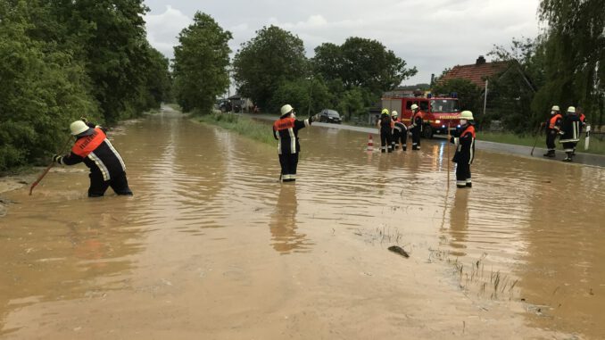 Fünf Stunden im Einsatz war auch die Feuerwehr Steinsfeld. In dem Wonfurter Ortsteil wurden mehrere Keller und Gebäude sowie die Ortsdurchfahrt von den Wassermassen heimgesucht. „Als langwierig gestaltete sich das Freischaffen eines Wasserdurchlasses um weitere Überschwemmungen zu verhindern“, sagte Kommandant und Einsatzleiter Matthias Henneberger. Hier wurde ein Steinsfelder Bürger mit schwerem Gerät hinzugezogen, um am Einlauf und Auslauf den Morast abzutragen.