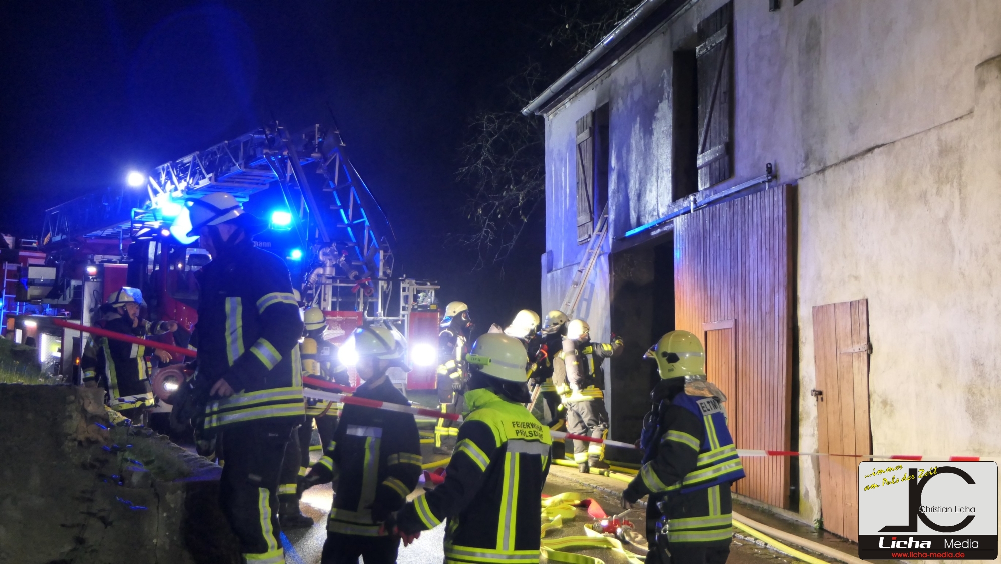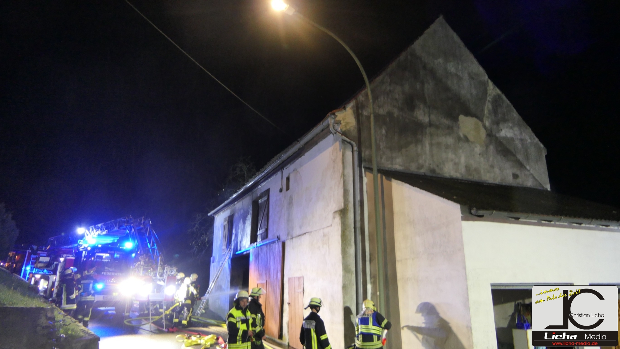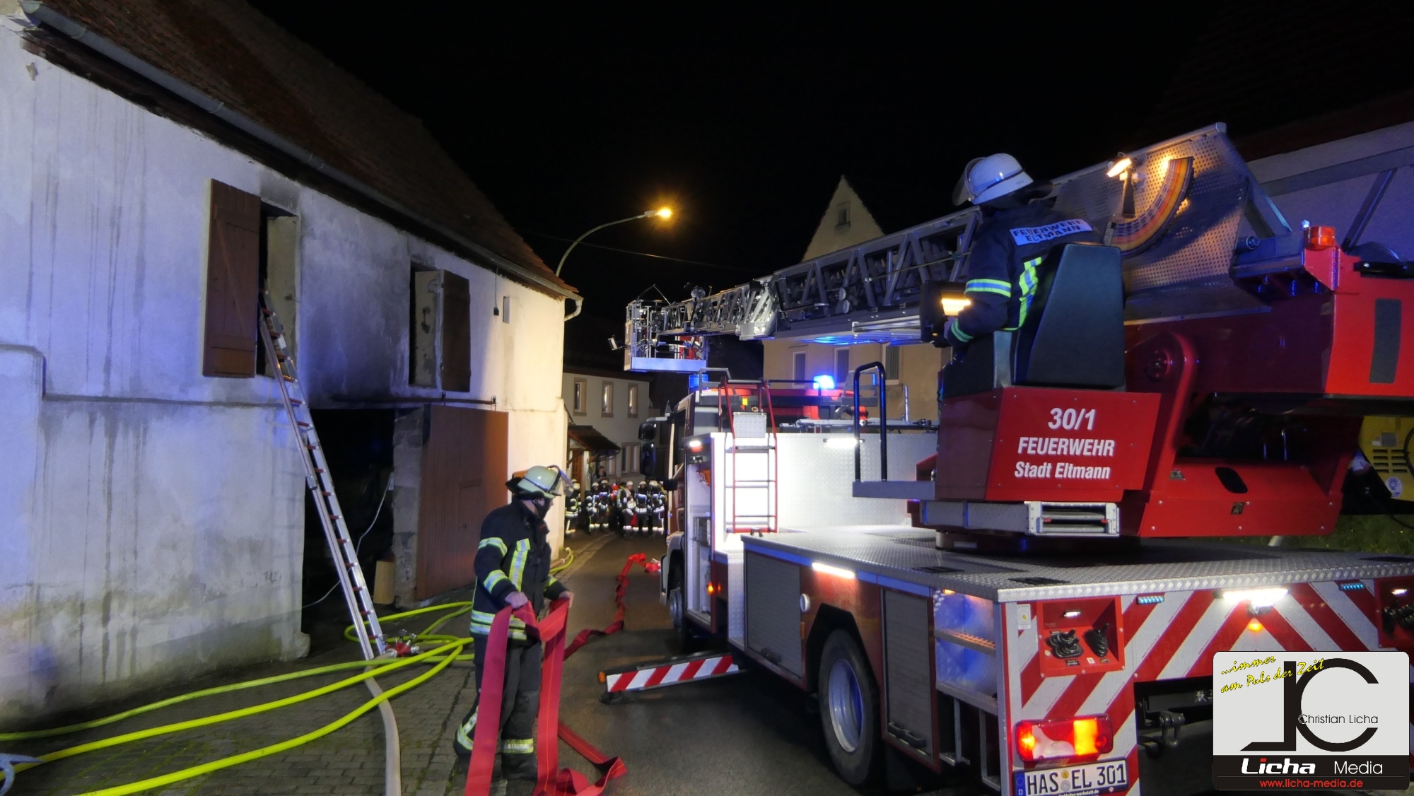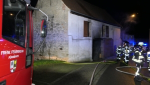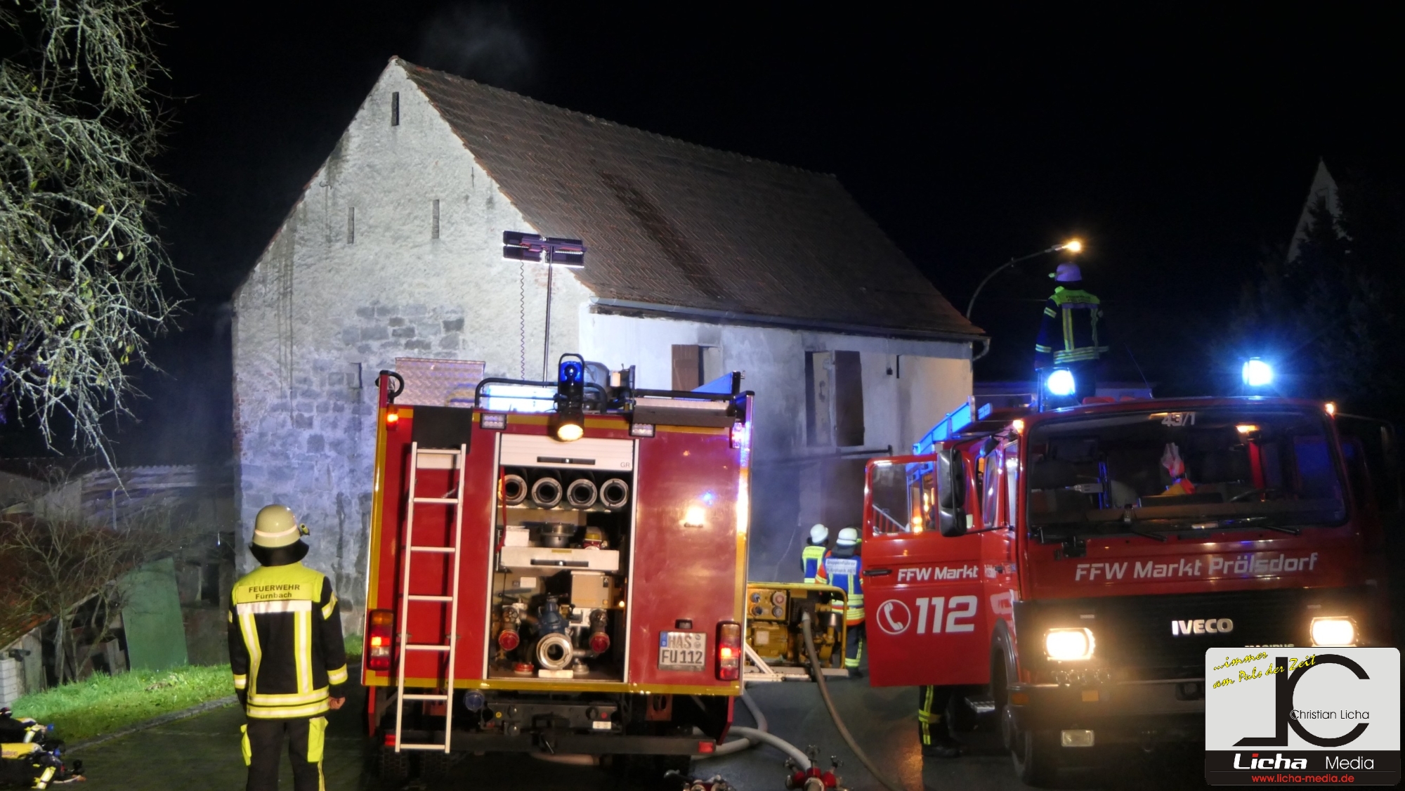 Als erste war die Feuerwehr Prölsdorf am Einsatzort und leitete den Innenangriff ein. „In der Scheune stand alles lichterloh in Flammen“, schilderte ein Feuerwehrmann die Lage. Betroffen waren ein dort abgestellter Seat Ibiza, ein größerer Brennholzvorrat sowie die hölzerne Dachkonstruktion. Nachdem das offene Feuer gelöscht war, wurde mithilfe der Drehleiter der Feuerwehr Eltmann das Dach an der First- und Giebelseite teilweise geöffnet, um letzte Glutnester aufzuspüren. Für die Drehleiter der Wallburgstadt war dies der erste Brandeinsatz seit ihrer Neuanschaffung im Sommer dieses Jahres. Einsatzleiter Roland Friedrich, Kommandant der Feuerwehr Fürnbach, erklärte: „Die Wasserversorgung erfolgte über Hydranten und den Löschweiher, zu dem eine rund 200 Meter lange Schlauchstrecke verlegt wurde.“ Der Rettungsdienst sicherte den Einsatz sanitätsdienstlich ab; verletzt wurde niemand.