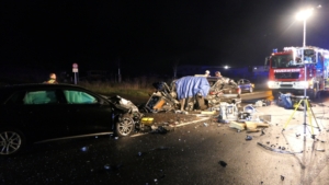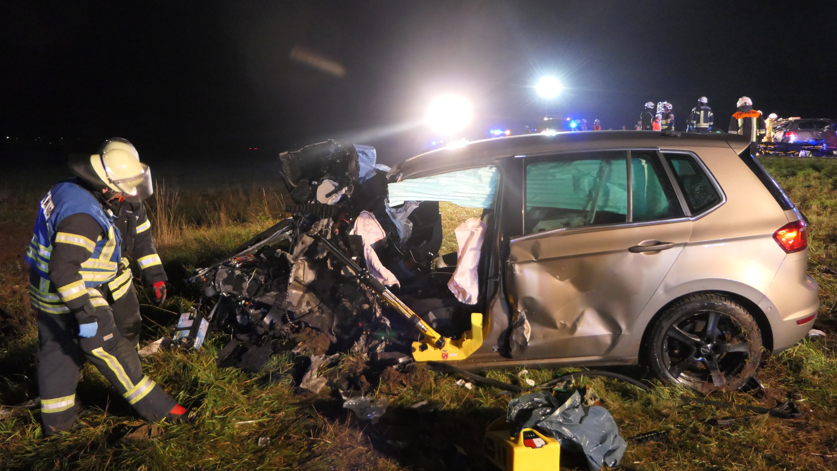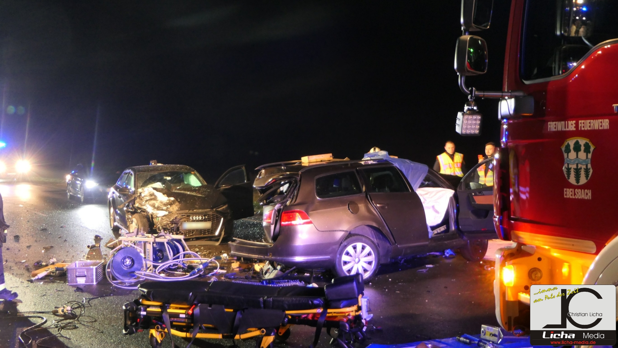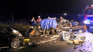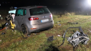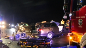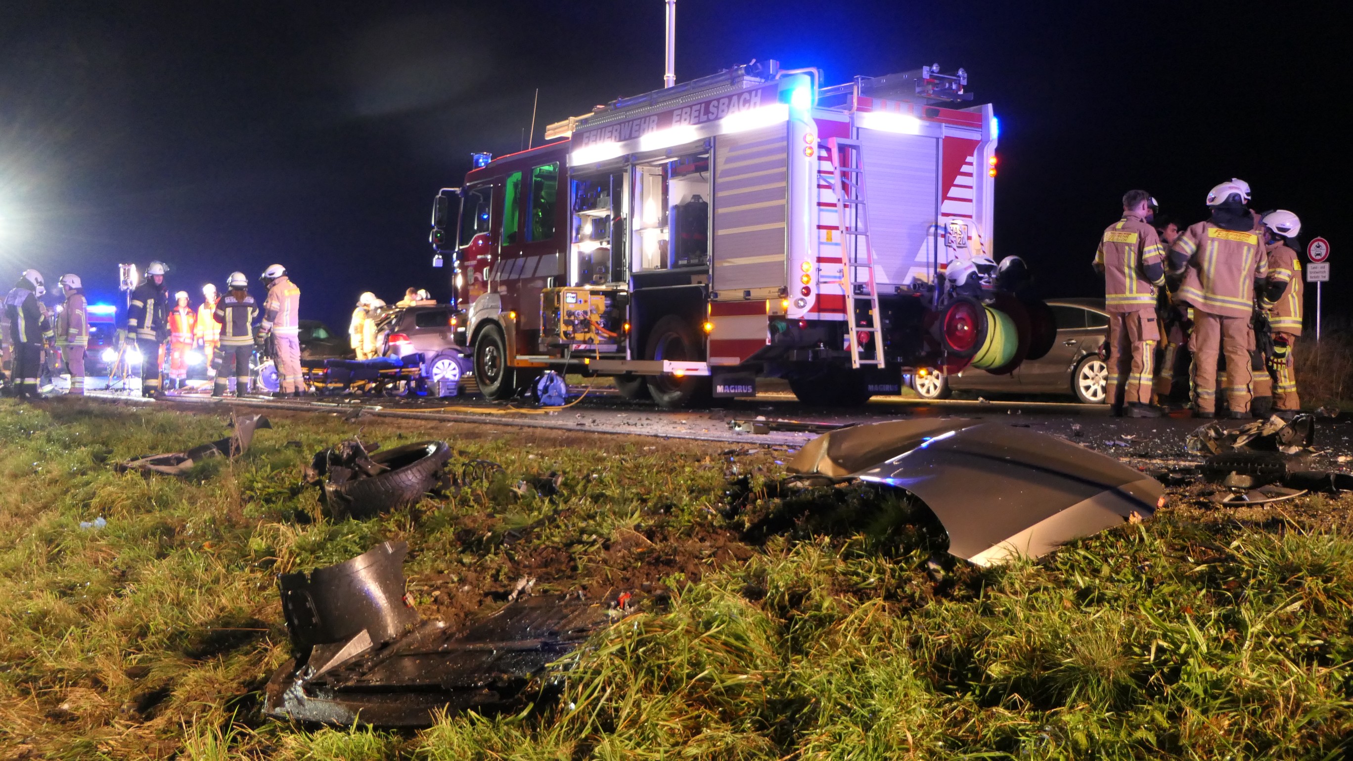Mit rund 80 Einsatzkräften waren die Feuerwehren aus Ebelsbach, Eltmann, Steinbach und Ziegelanger nach der Alarmierung durch die Integrierte Leitstelle (ILS) Schweinfurt schnell an der Unfallstelle. Parallel arbeiteten die Ebelsbacher und die Eltmanner Wehren mit zwei hydraulischen Rettungssätzen, um die eingeklemmten Fahrer zu befreien. Beim Golf-Fahrer gelang dies sofort. Der Passat-Fahrer war jedoch massiv eingeklemmt, wie Ebelsbachs Kommandant und Einsatzleiter Sascha Schöpplein sowie sein Stellvertreter Dominik Mauer erklärten. Es gelang zwar dem Rettungsdienst, einen Zugang zum Fahrzeug zu schaffen, doch trotz aller Bemühungen und einer Reanimation verstarb der 49-Jährige noch im Wrack seines Autos. Die beiden anderen Unfallbeteiligten wurden schwer verletzt in Krankenhäuser eingeliefert. Nach Angaben der Polizei bestand zumindest für sie keine Lebensgefahr.