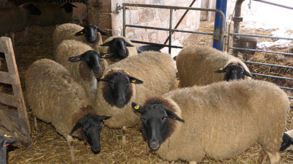 Neben rund 120 Mutterschafen der Rasse Rhönschaf leben auf dem Bauernhof in dem Oberauracher Ortsteil etwa 100 Hühner, 20 Ziegen und Hütehund Finn. In den Wintermonaten hat Finn weniger zu tun, denn die Schafe stehen dann nicht auf den Weiden im Steigerwald, sondern im Offenfrontstall. Diese besondere Stallform ist zur Längsseite hin offen, lässt Sonne und frische Luft herein und schützt gleichzeitig vor Wind. Gut eingestreute Liegebereiche sorgen für Wärme und Ruhe. Ziel ist eine möglichst artgerechte Haltung der Tiere.