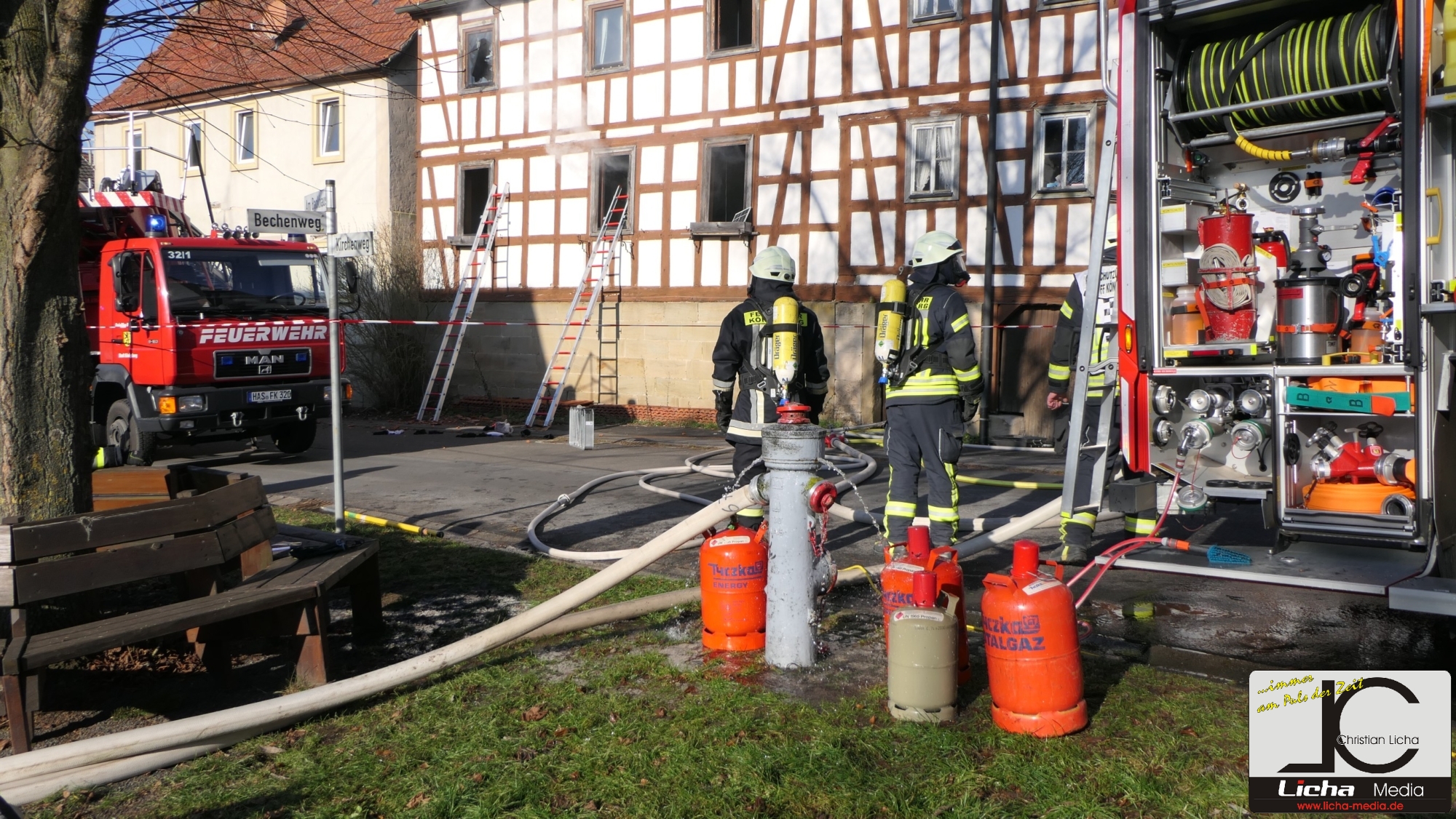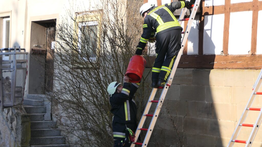 Insgesamt vier Gasflaschen, die sich in dem Haus befanden, wurden von der Feuerwehr in Sicherheit gebracht. Foto: © Christian Licha