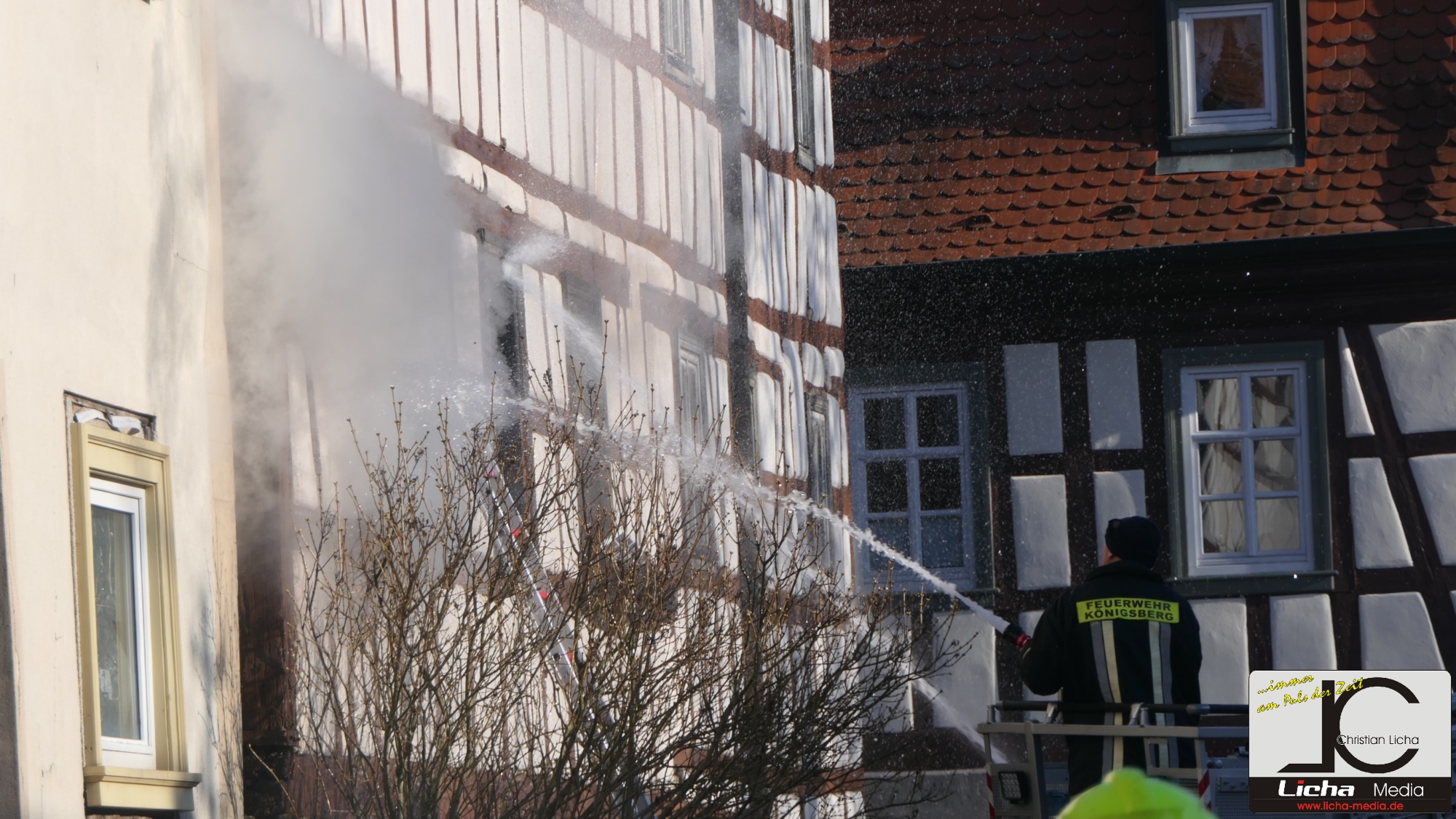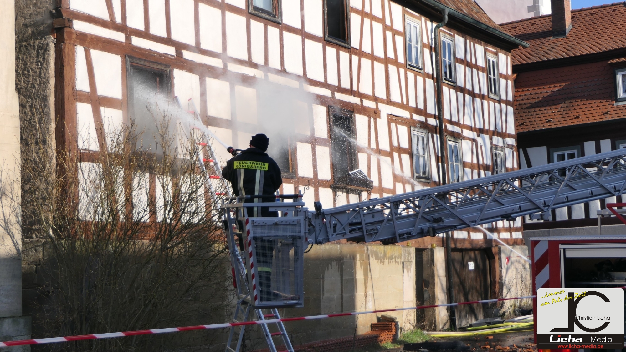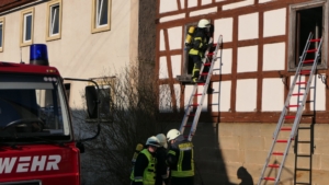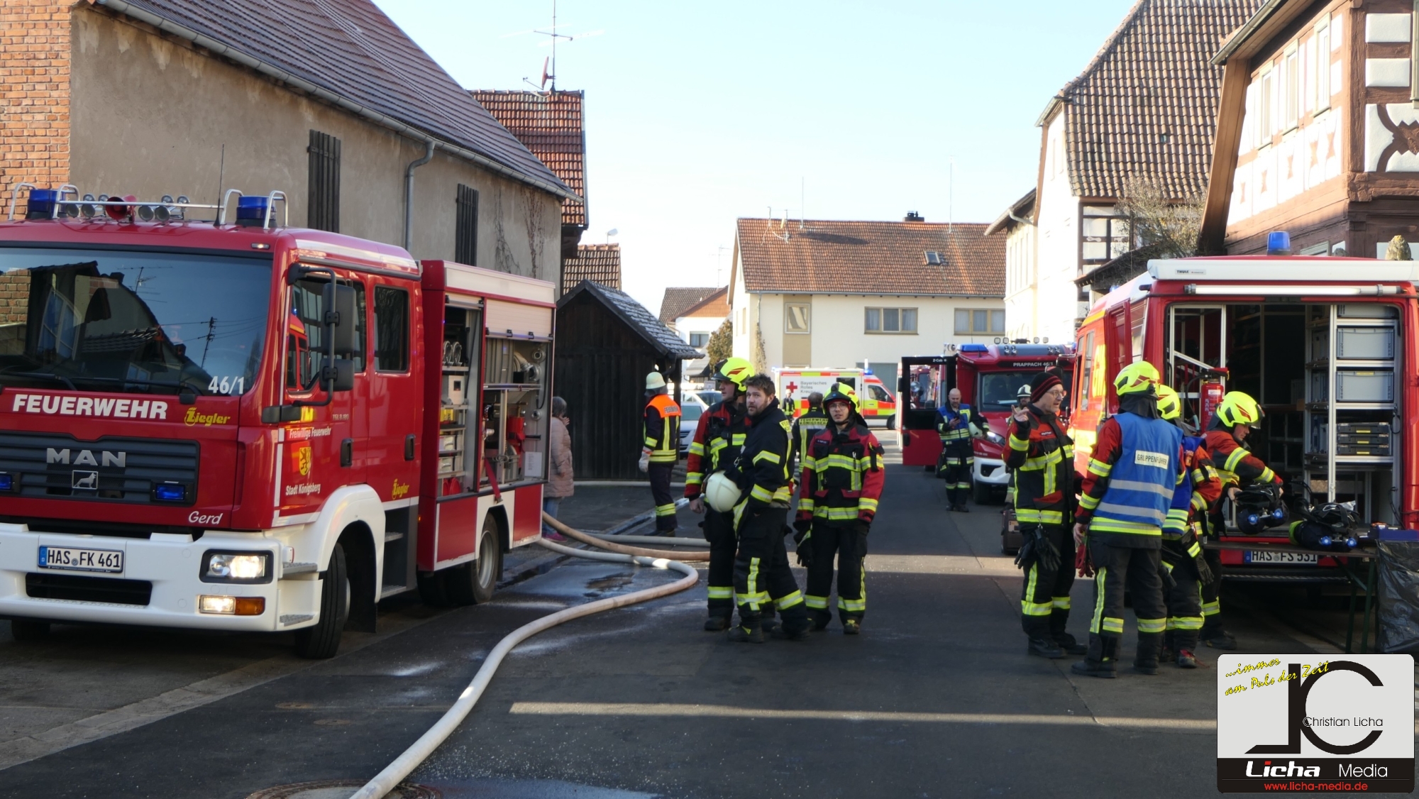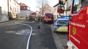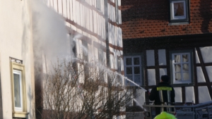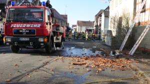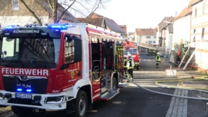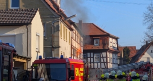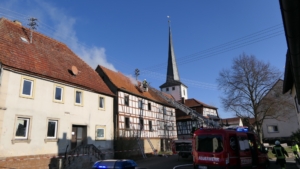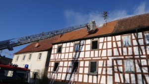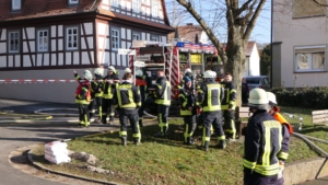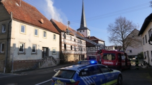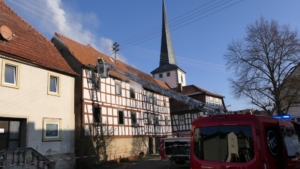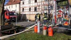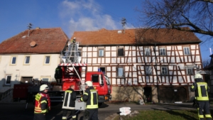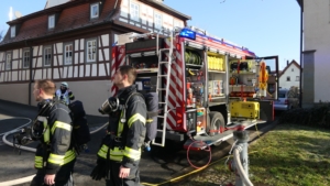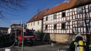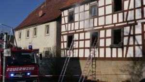 Königsberg / Hellingen, Lkr. Haßberge. Die Einwohner des Königsberger Stadtteils Hellingen wurden am Mittwochvormittag durch die Sirene aufgeschreckt. Mitten im Dorf quoll dichter Rauch aus einem Fachwerkhaus, in dem ein Brand ausgebrochen war. Die Löscharbeiten gestalteten sich schwierig und zogen sich bis in die späten Nachmittagsstunden hin. Erschwert wurden die Löscharbeiten zusätzlich durch Glatteisbildung infolge des ausgetretenen Löschwassers bei winterlichen Temperaturen.