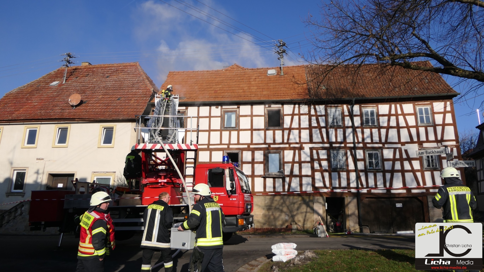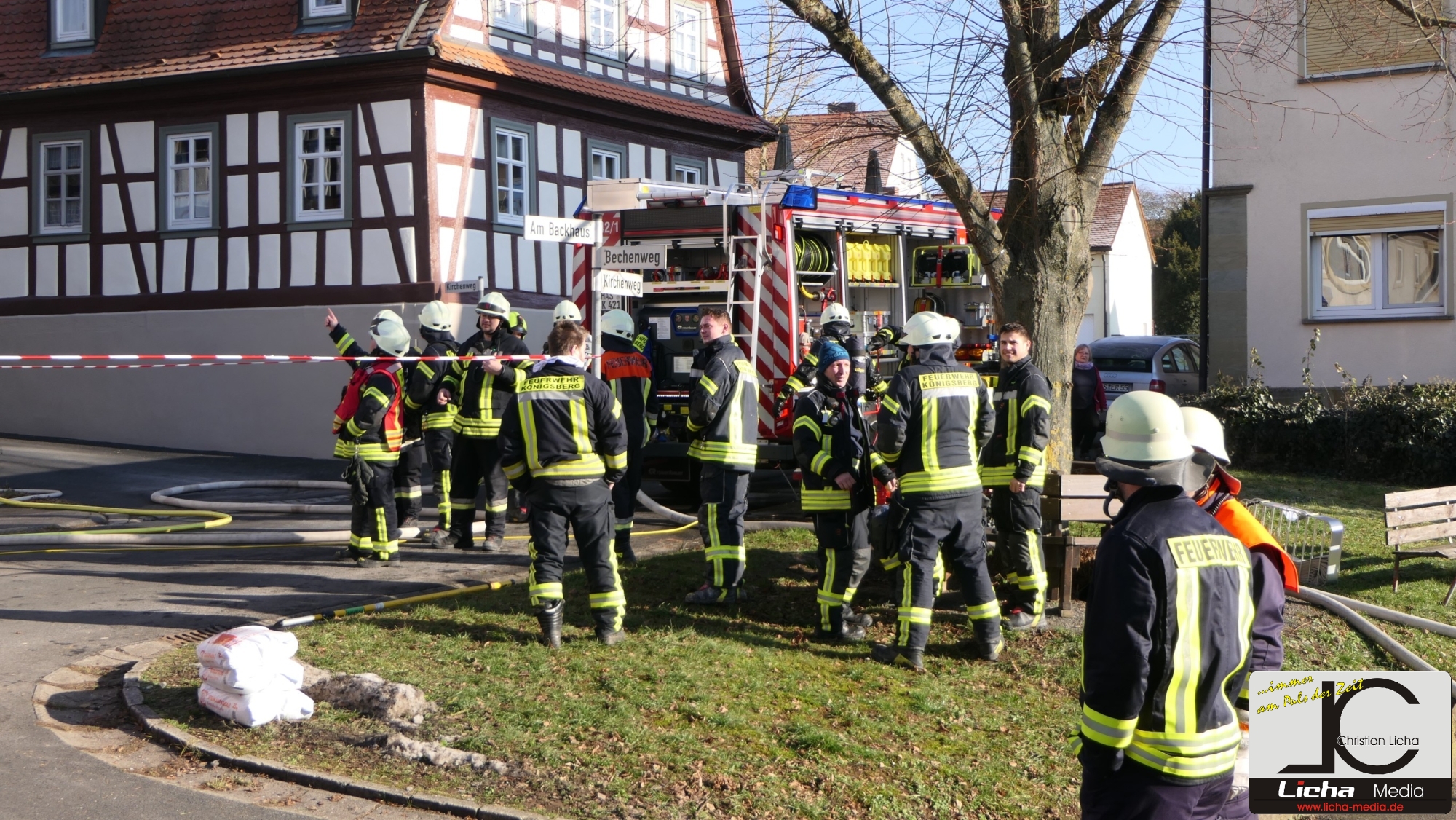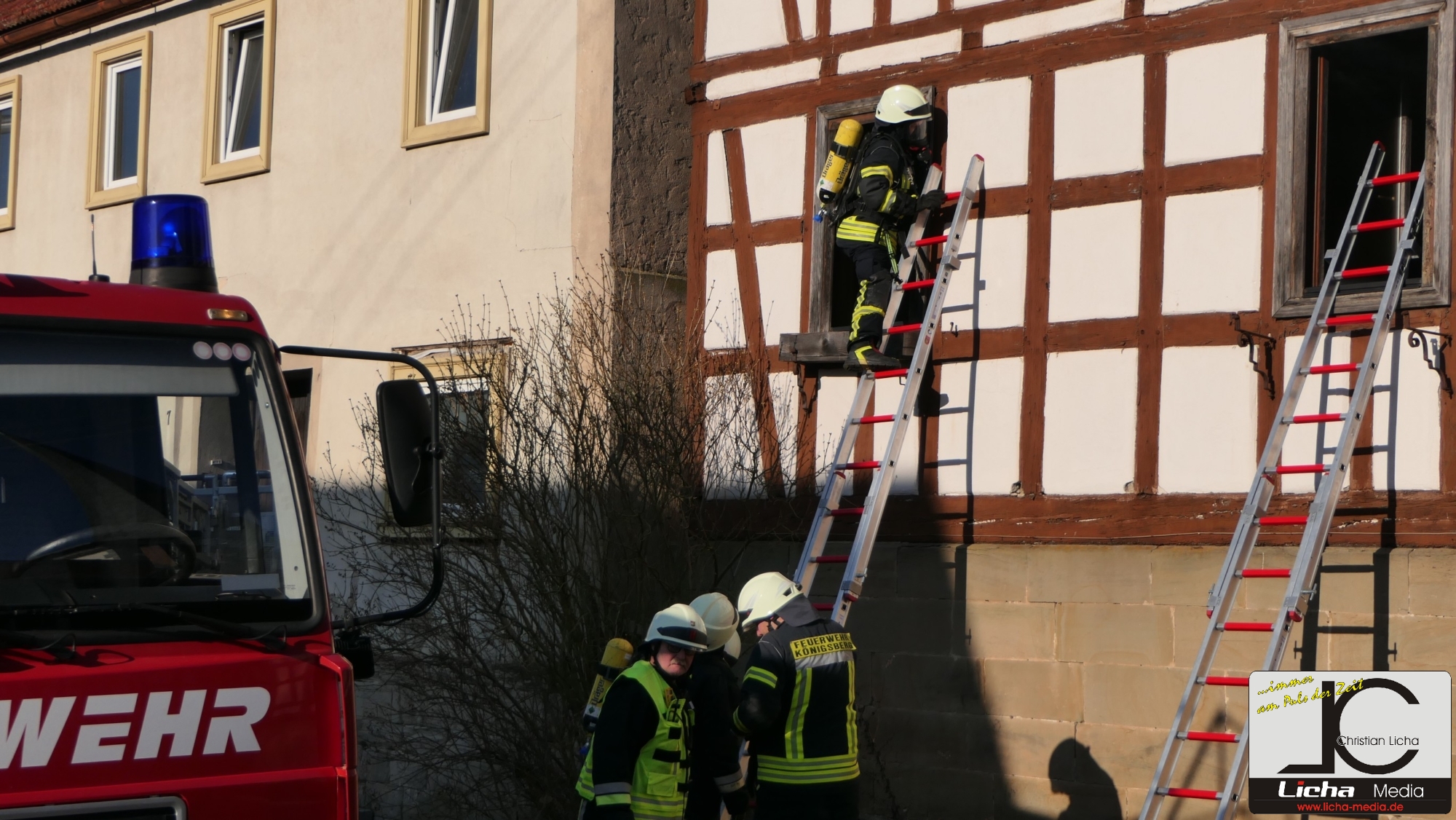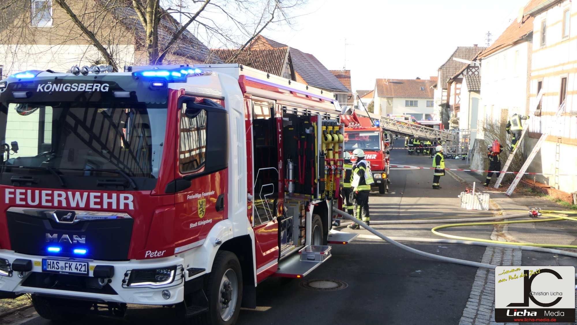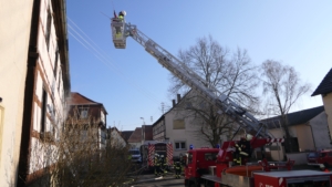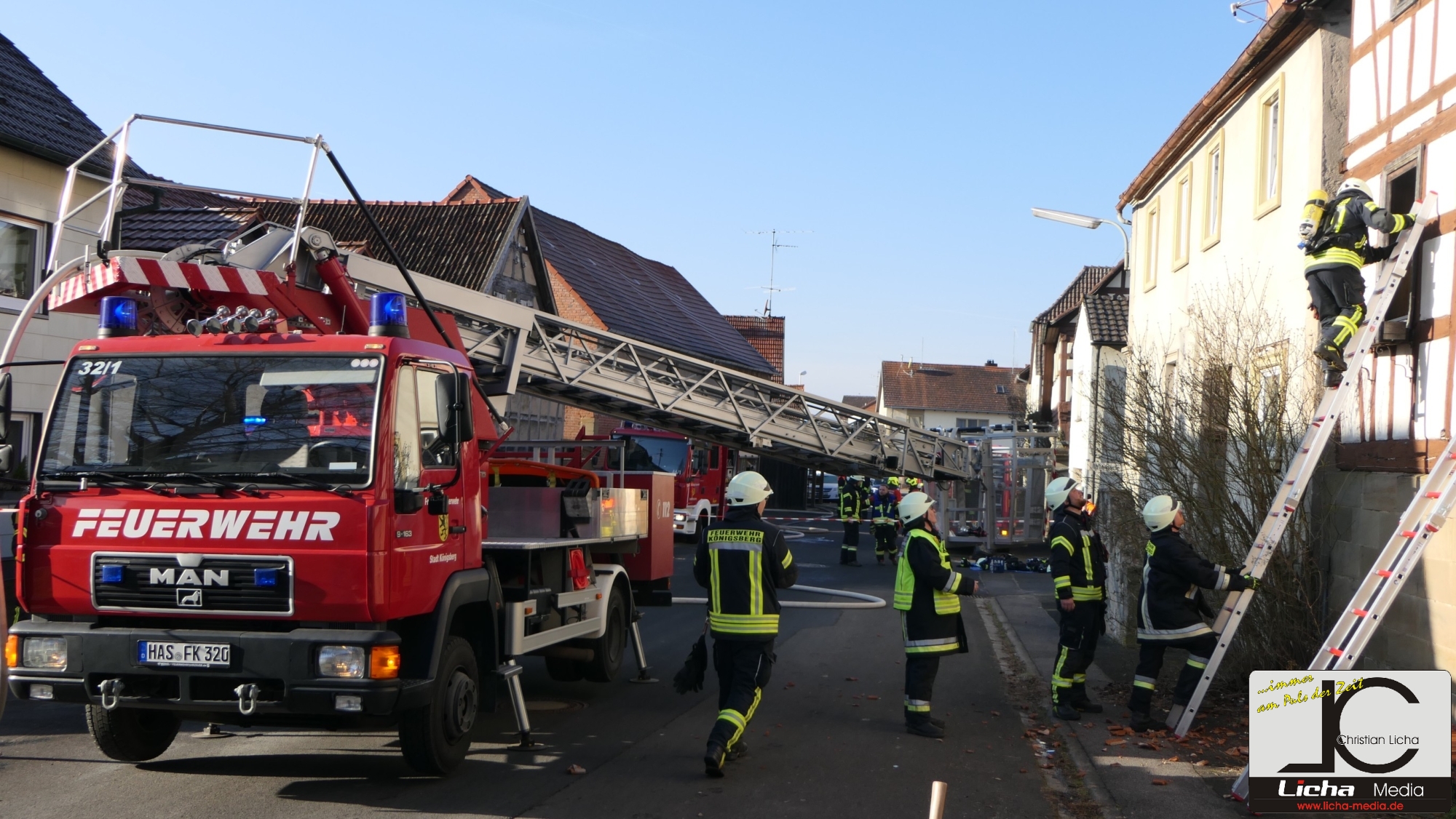 Königsberg / Hellingen, Lkr. Haßberge. Die Einwohner des Königsberger Stadtteils Hellingen wurden am Mittwochvormittag durch die Sirene aufgeschreckt. Mitten im Dorf quoll dichter Rauch aus einem Fachwerkhaus, in dem ein Brand ausgebrochen war. Die Löscharbeiten gestalteten sich schwierig und zogen sich bis in die späten Nachmittagsstunden hin. Erschwert wurden die Löscharbeiten zusätzlich durch Glatteisbildung infolge des ausgetretenen Löschwassers bei winterlichen Temperaturen.