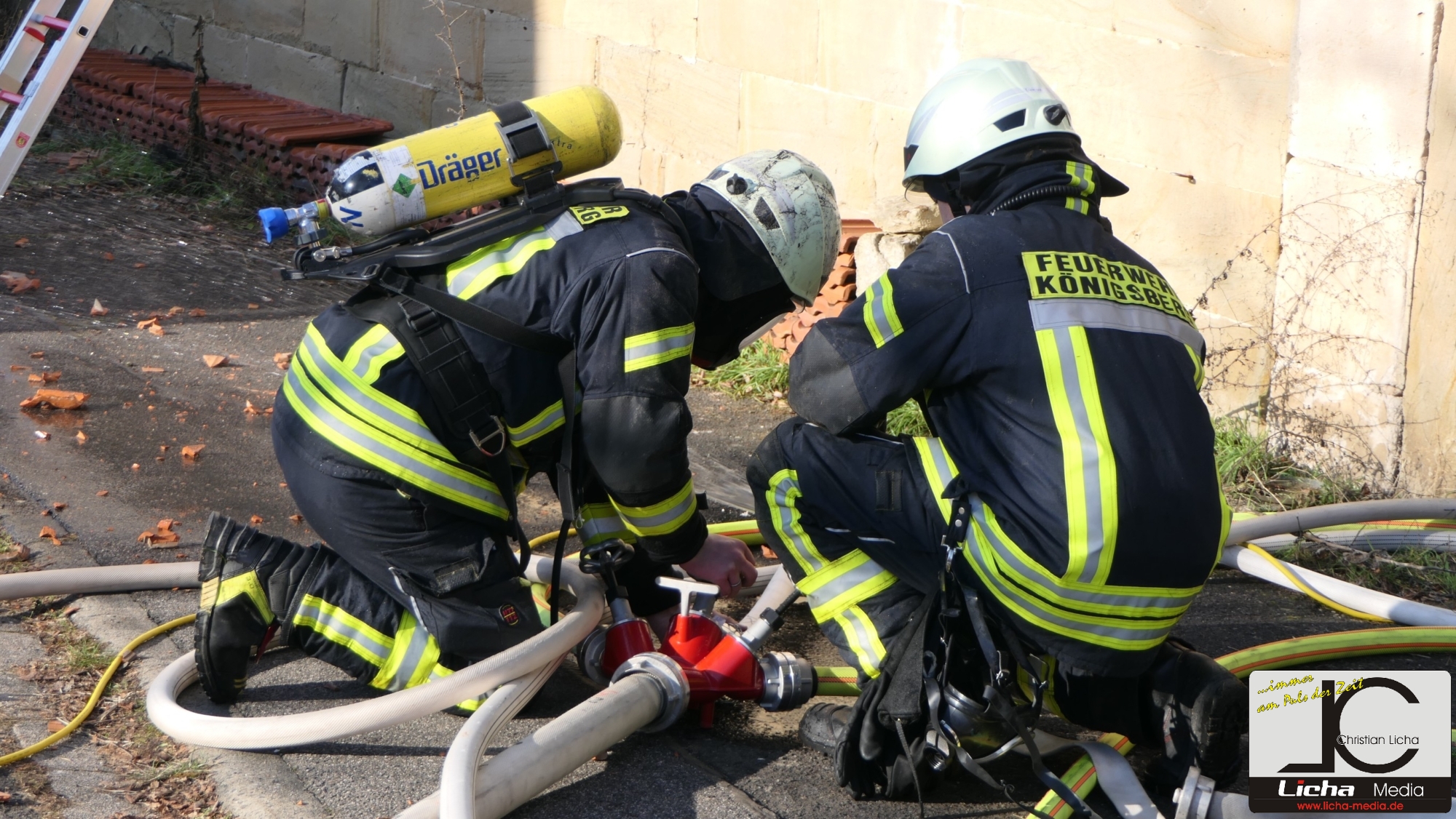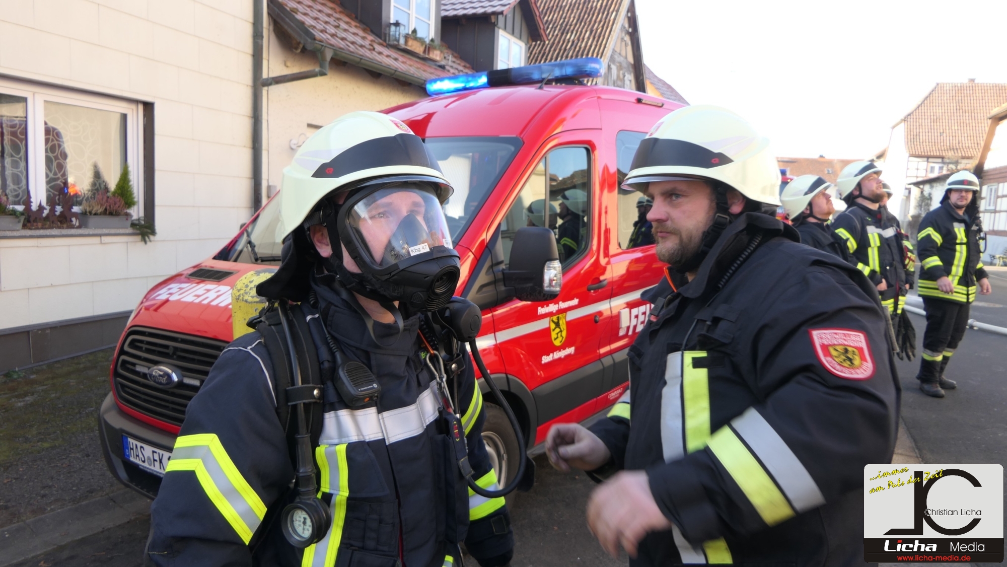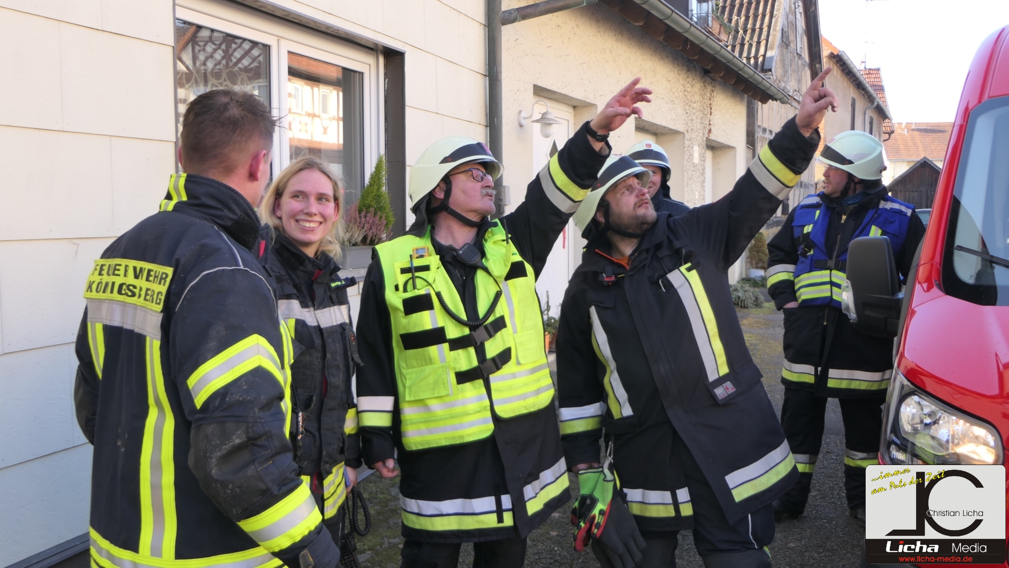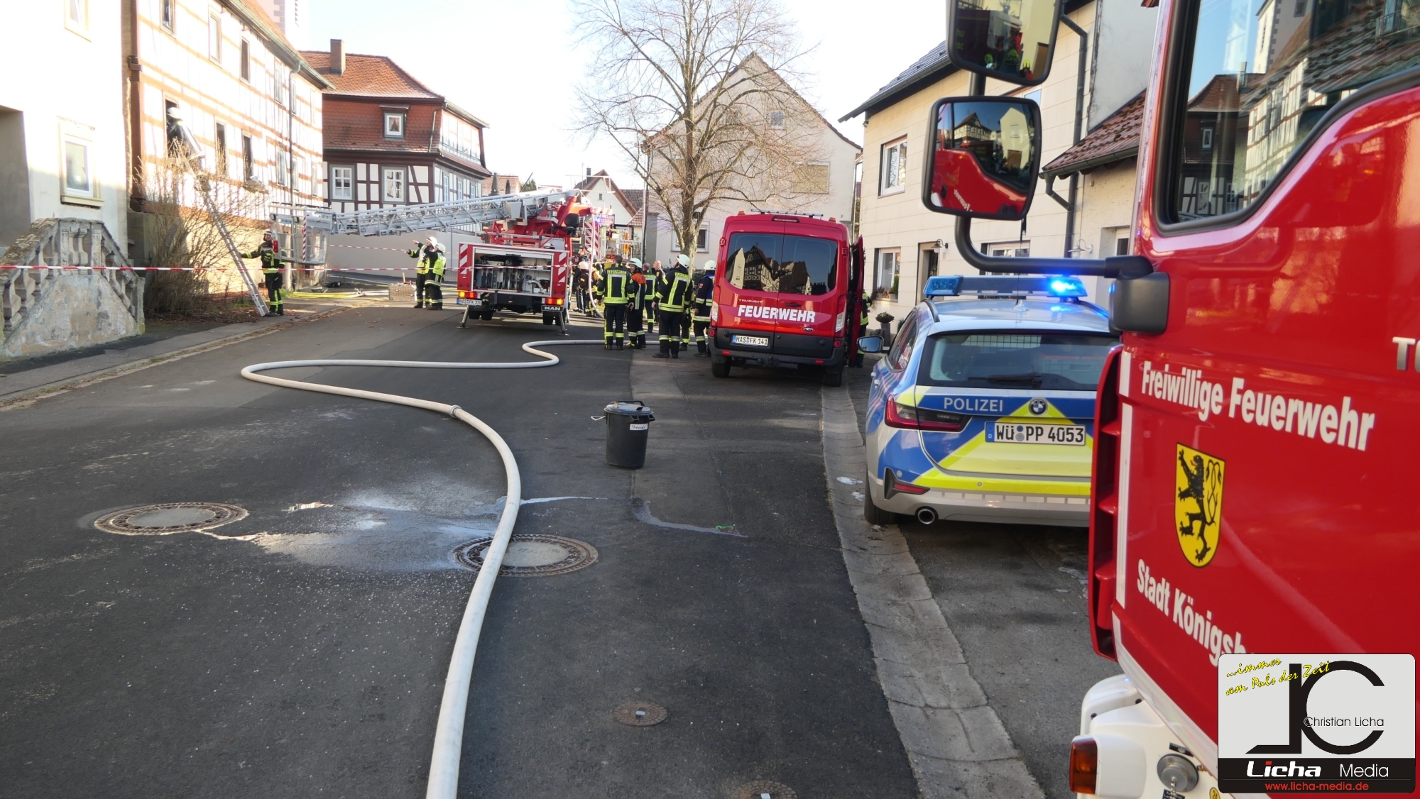 Königsberg / Hellingen, Lkr. Haßberge. Die Einwohner des Königsberger Stadtteils Hellingen wurden am Mittwochvormittag durch die Sirene aufgeschreckt. Mitten im Dorf quoll dichter Rauch aus einem Fachwerkhaus, in dem ein Brand ausgebrochen war. Die Löscharbeiten gestalteten sich schwierig und zogen sich bis in die späten Nachmittagsstunden hin. Erschwert wurden die Löscharbeiten zusätzlich durch Glatteisbildung infolge des ausgetretenen Löschwassers bei winterlichen Temperaturen.