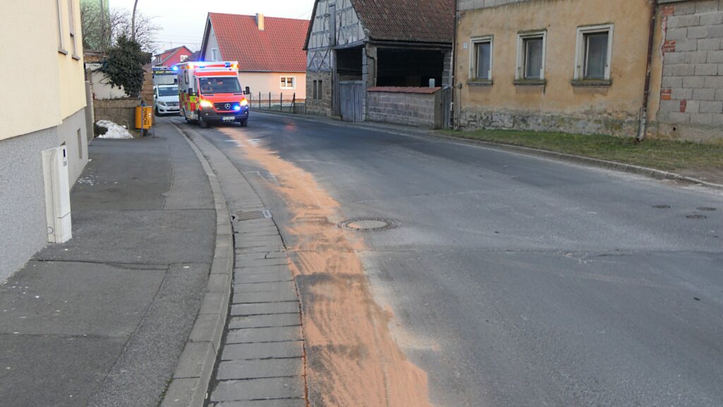Im Zuge des Einsatzes wurden die Feuerwehrkräfte zudem auf eine Dieselspur aufmerksam, die sich durch den Ort zog und darüber hinaus fortsetzte. Augenscheinlich wurde sie von dem Traktor des Verunglückten verursacht. Ob und in welchem Zusammenhang diese Dieselspur mit dem Unfallgeschehen steht, war vor Ort zunächst noch unklar. Die Feuerwehr streute die Dieselspur im Ortsbereich zunächst mit Bindemittel ab. Anschließend wurde sie durch ein Fachunternehmen mit einer Reinigungsmaschine vollständig entfernt.