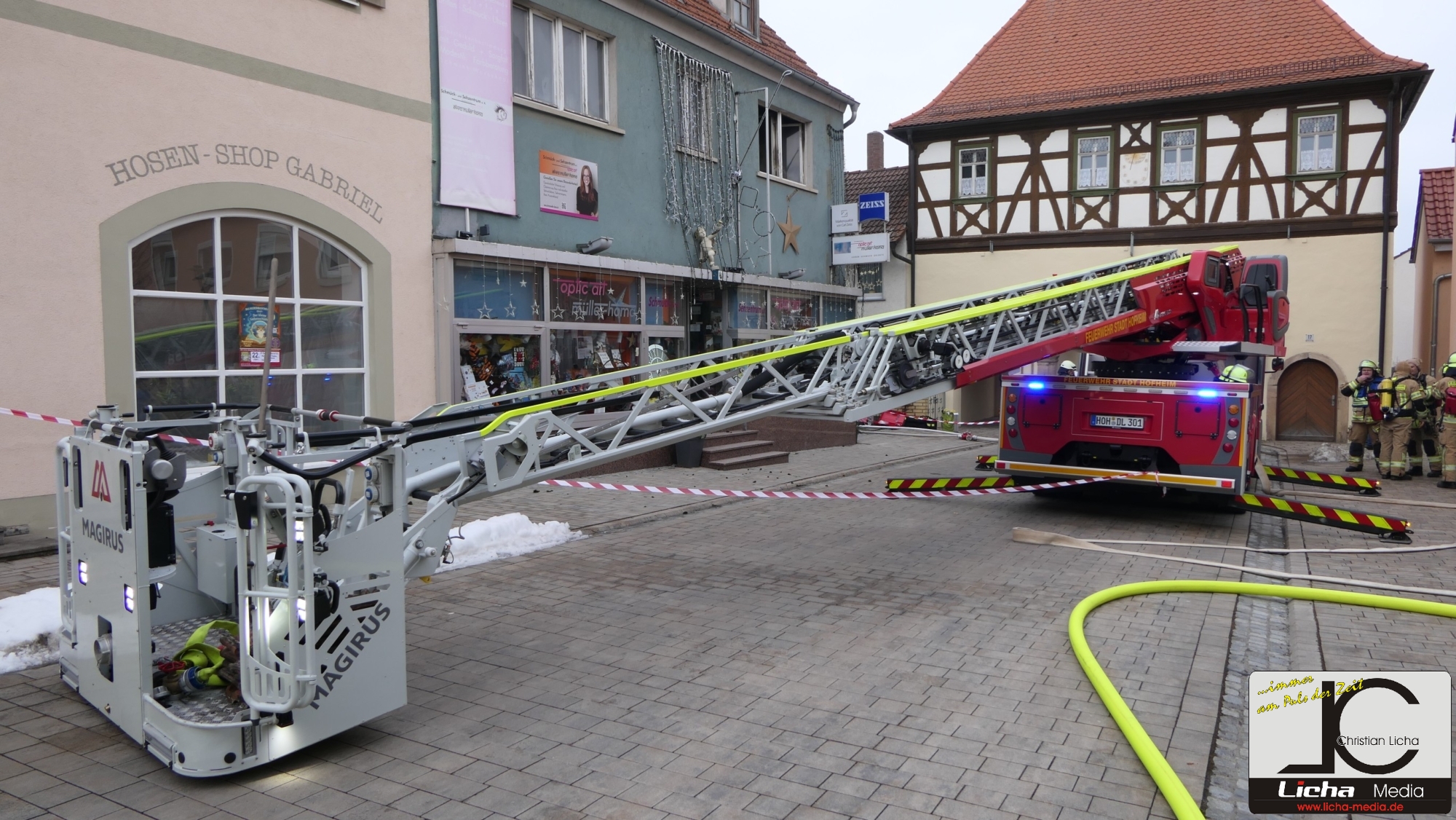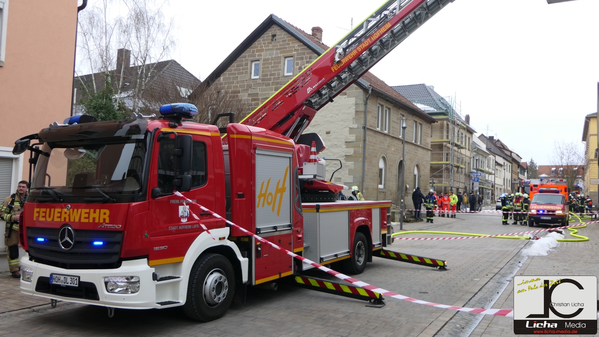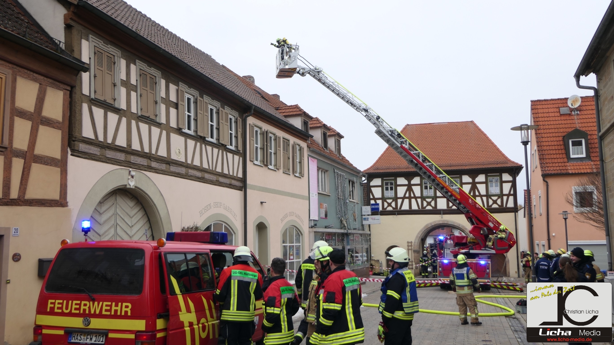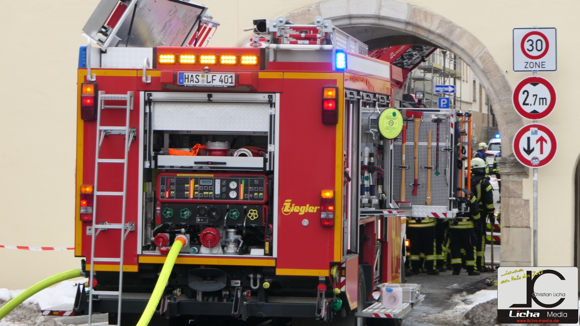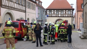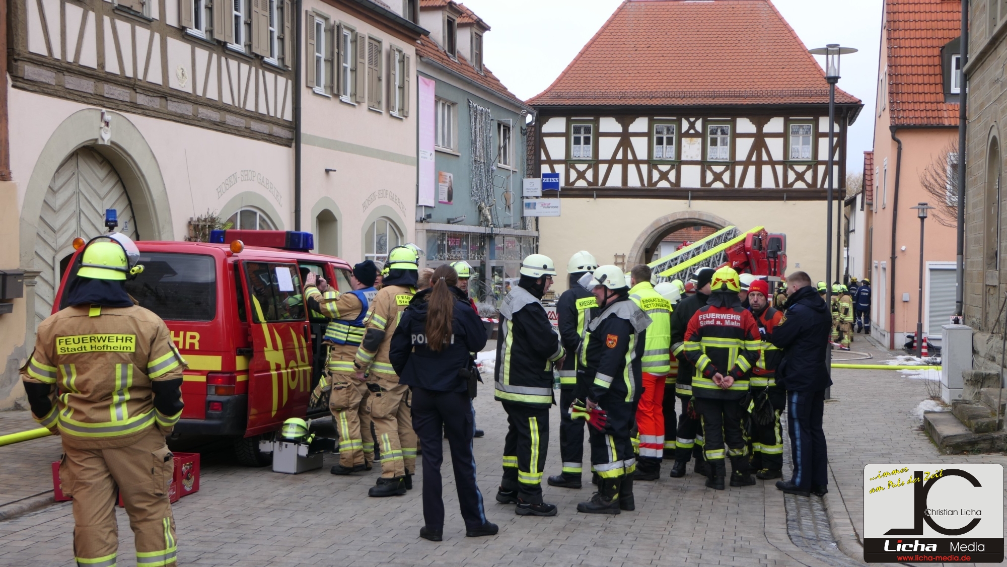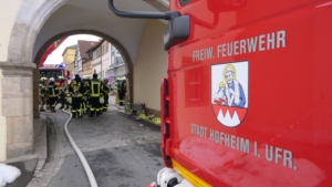 Hofheim, Lkr. Haßberge. Ein gemeldeter Zimmerbrand mit einer Person in Gefahr hat am Montagvormittag einen Großeinsatz der Feuerwehr in der dicht bebauten Hofheimer Altstadt ausgelöst. In einem Wohn- und Geschäftshaus in der Landgerichtsstraße war im ersten Obergeschoss ein Feuer ausgebrochen.
