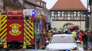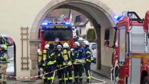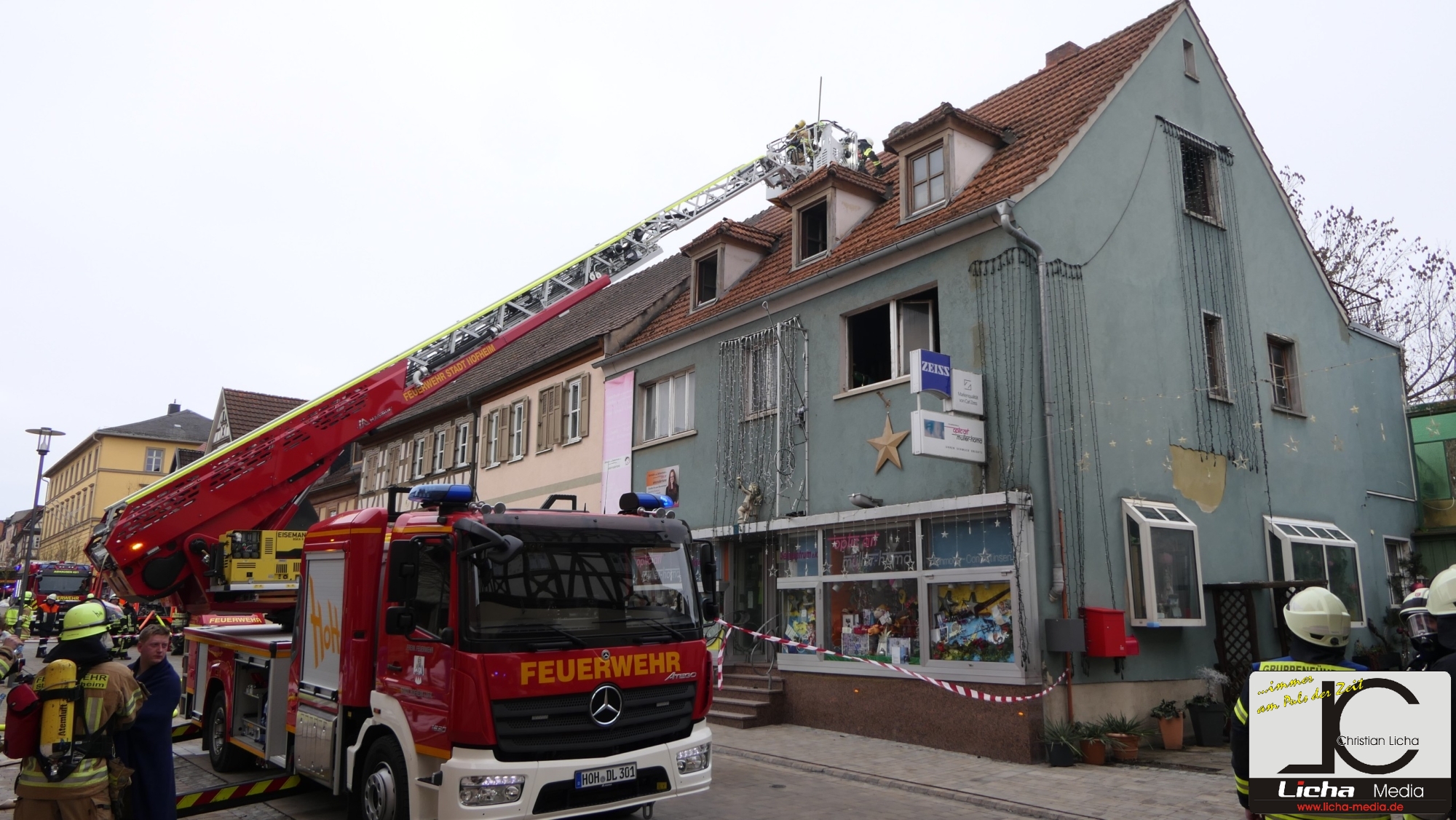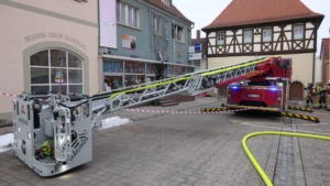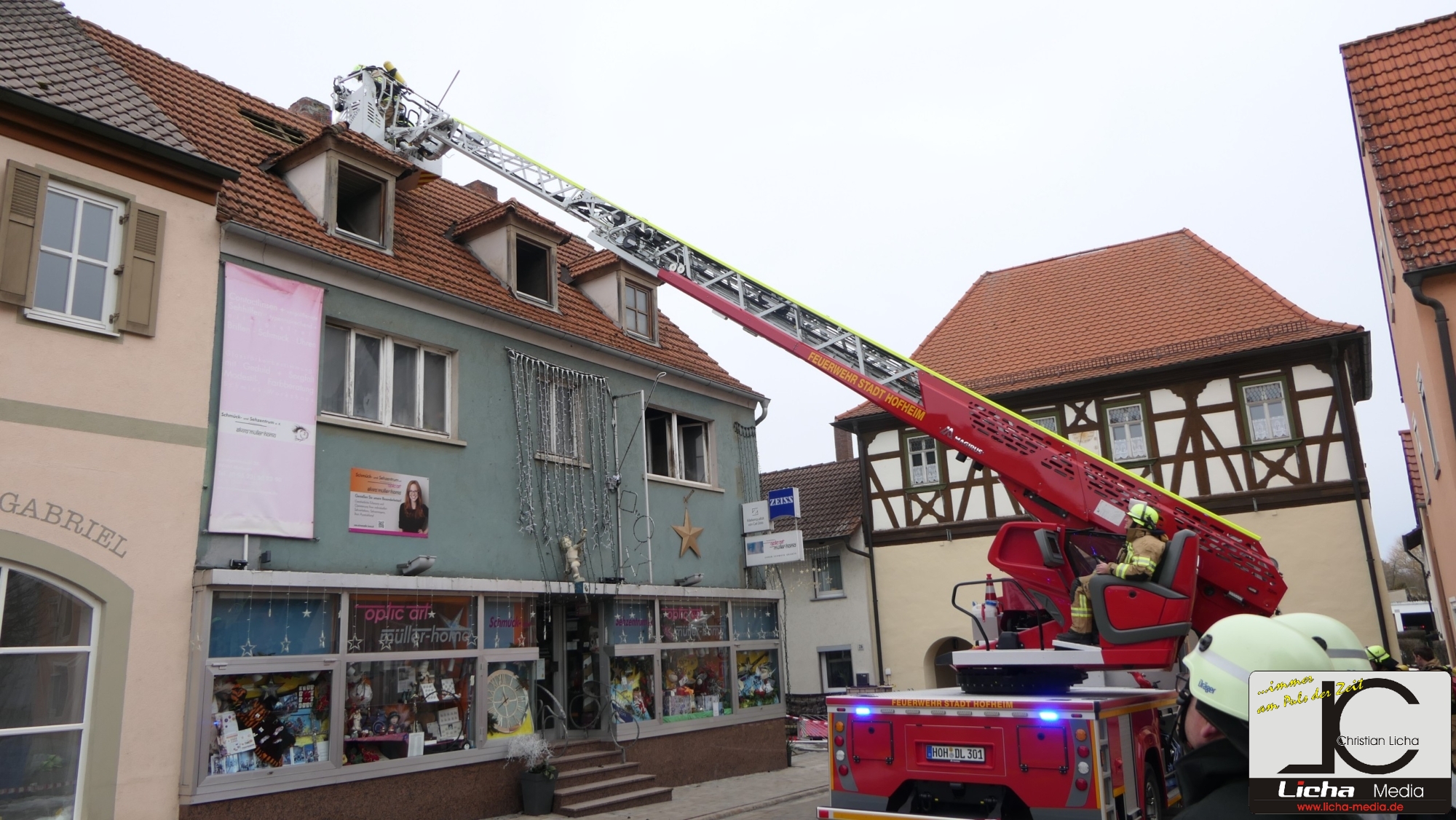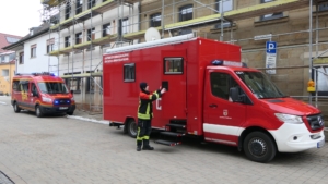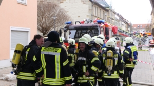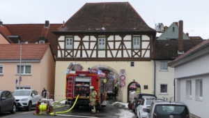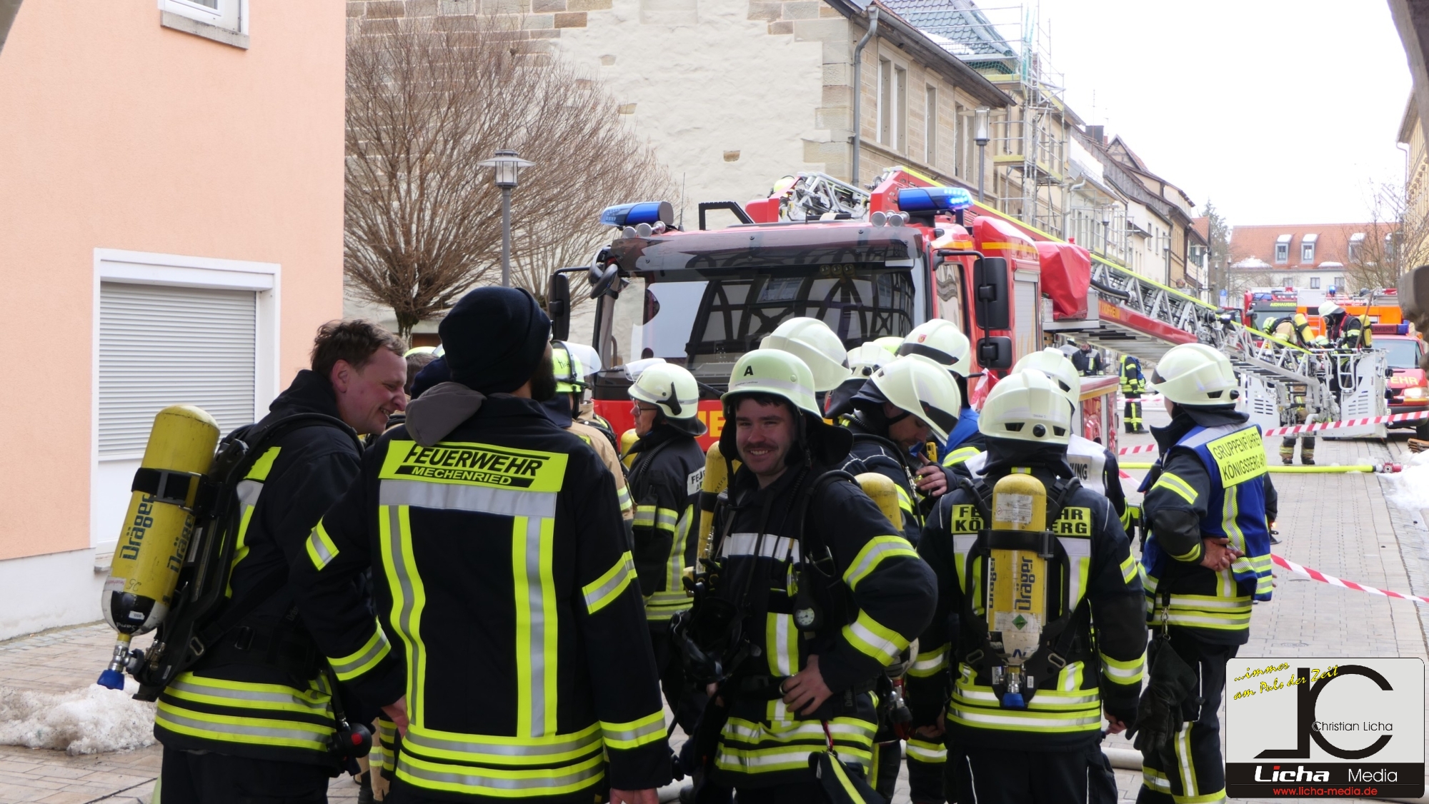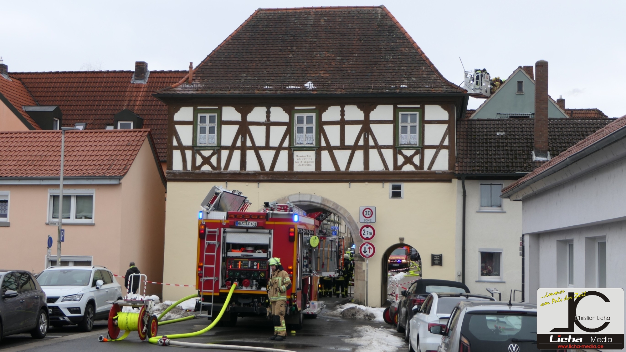 Hofheim, Lkr. Haßberge. Ein gemeldeter Zimmerbrand mit einer Person in Gefahr hat am Montagvormittag einen Großeinsatz der Feuerwehr in der dicht bebauten Hofheimer Altstadt ausgelöst. In einem Wohn- und Geschäftshaus in der Landgerichtsstraße war im ersten Obergeschoss ein Feuer ausgebrochen.