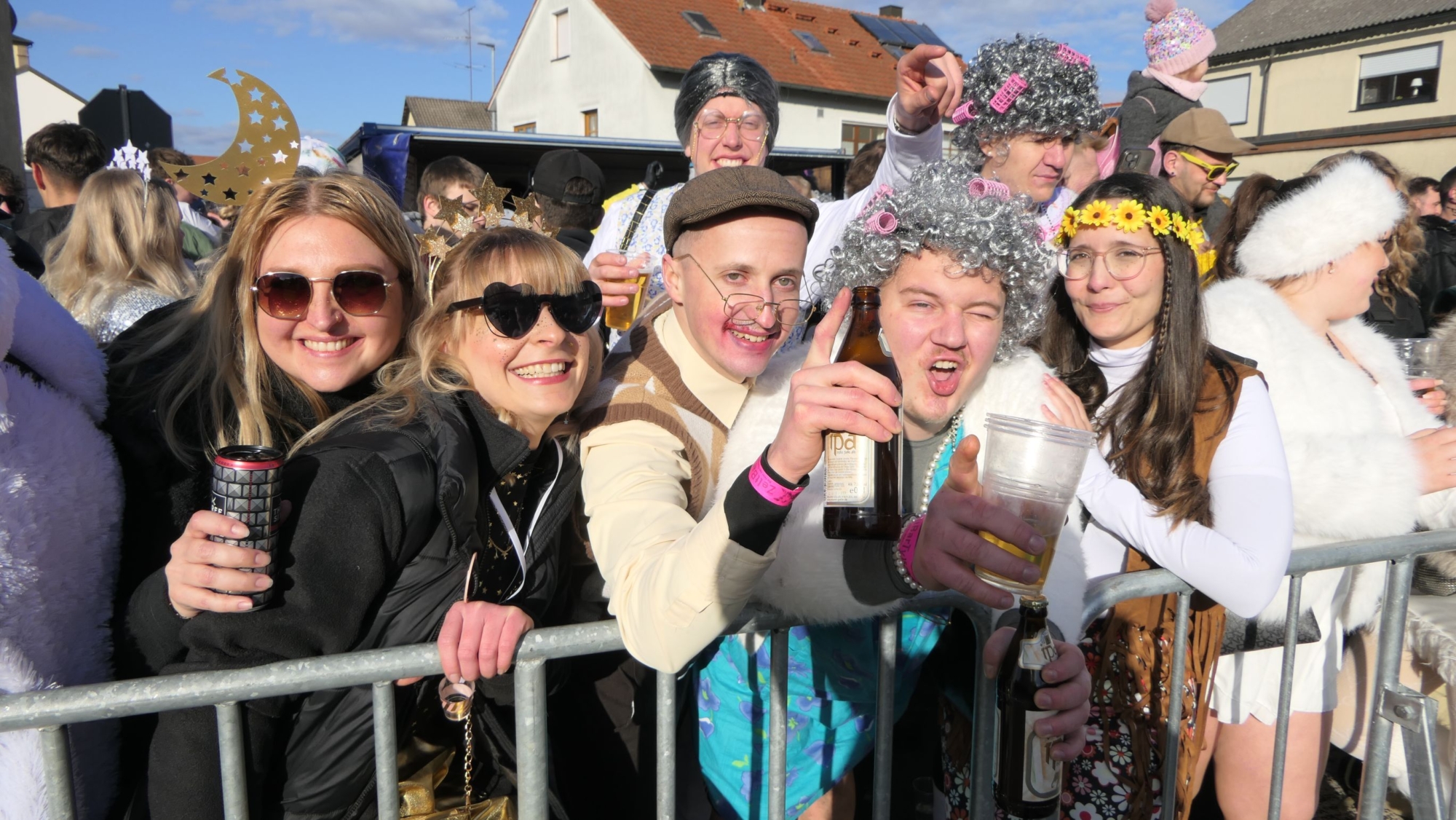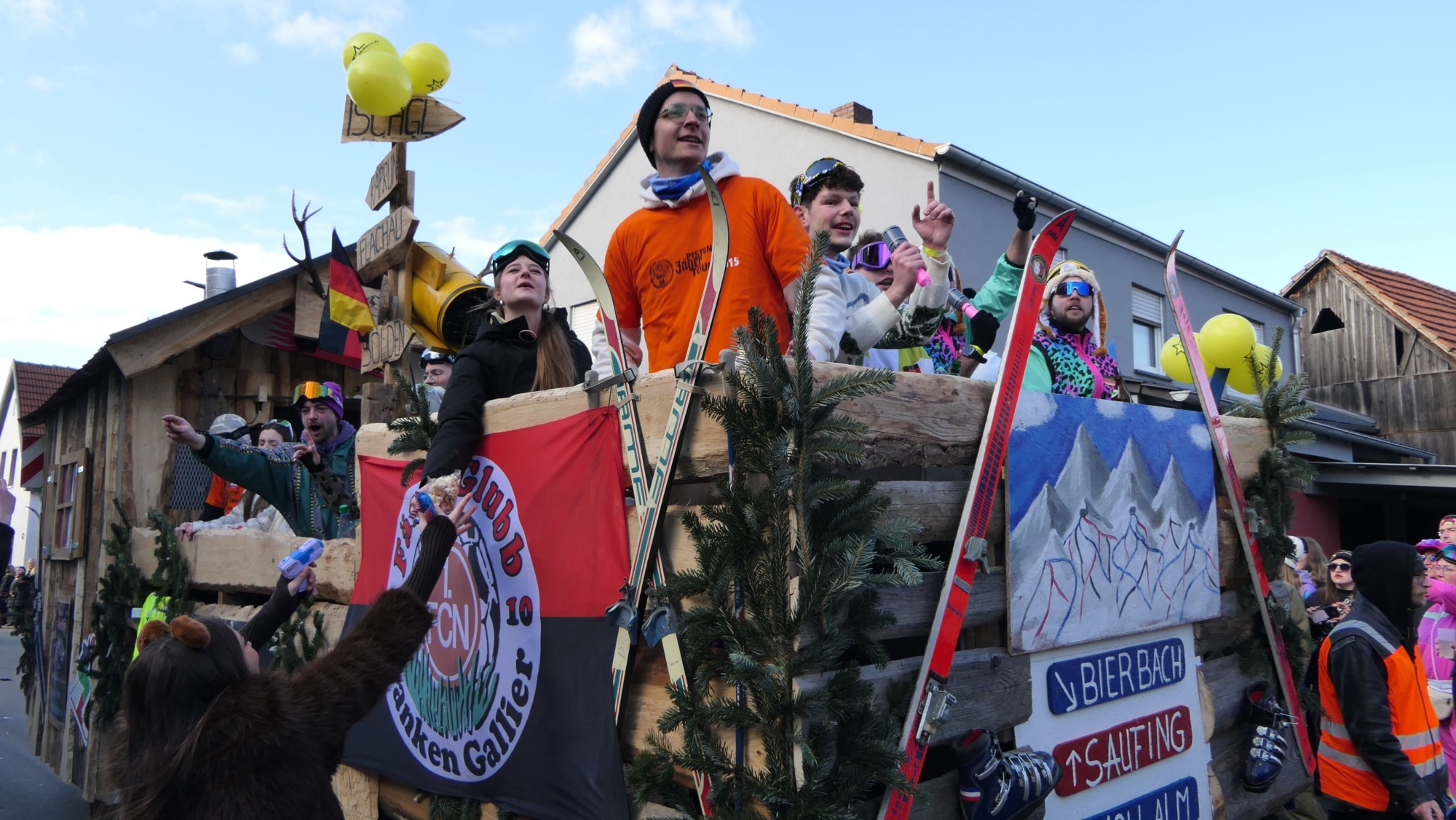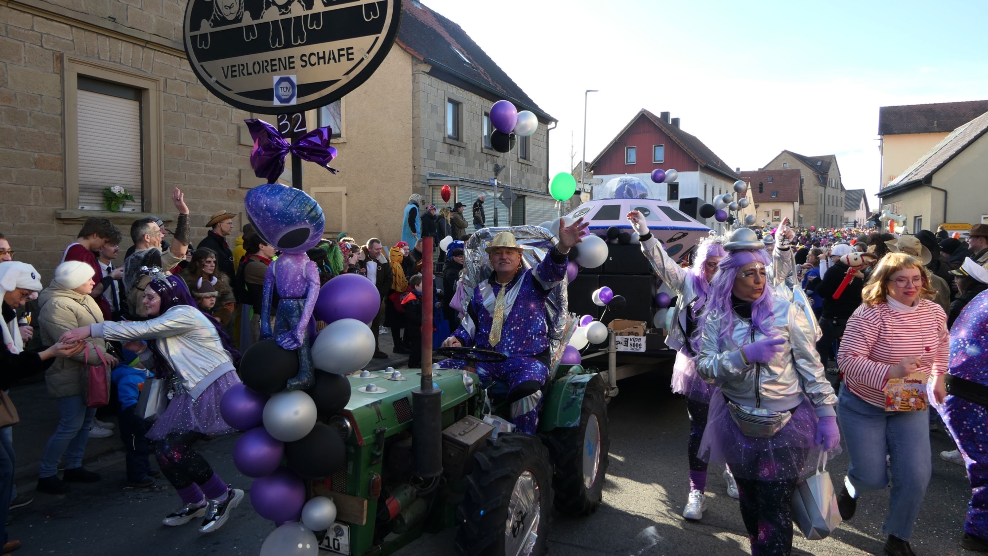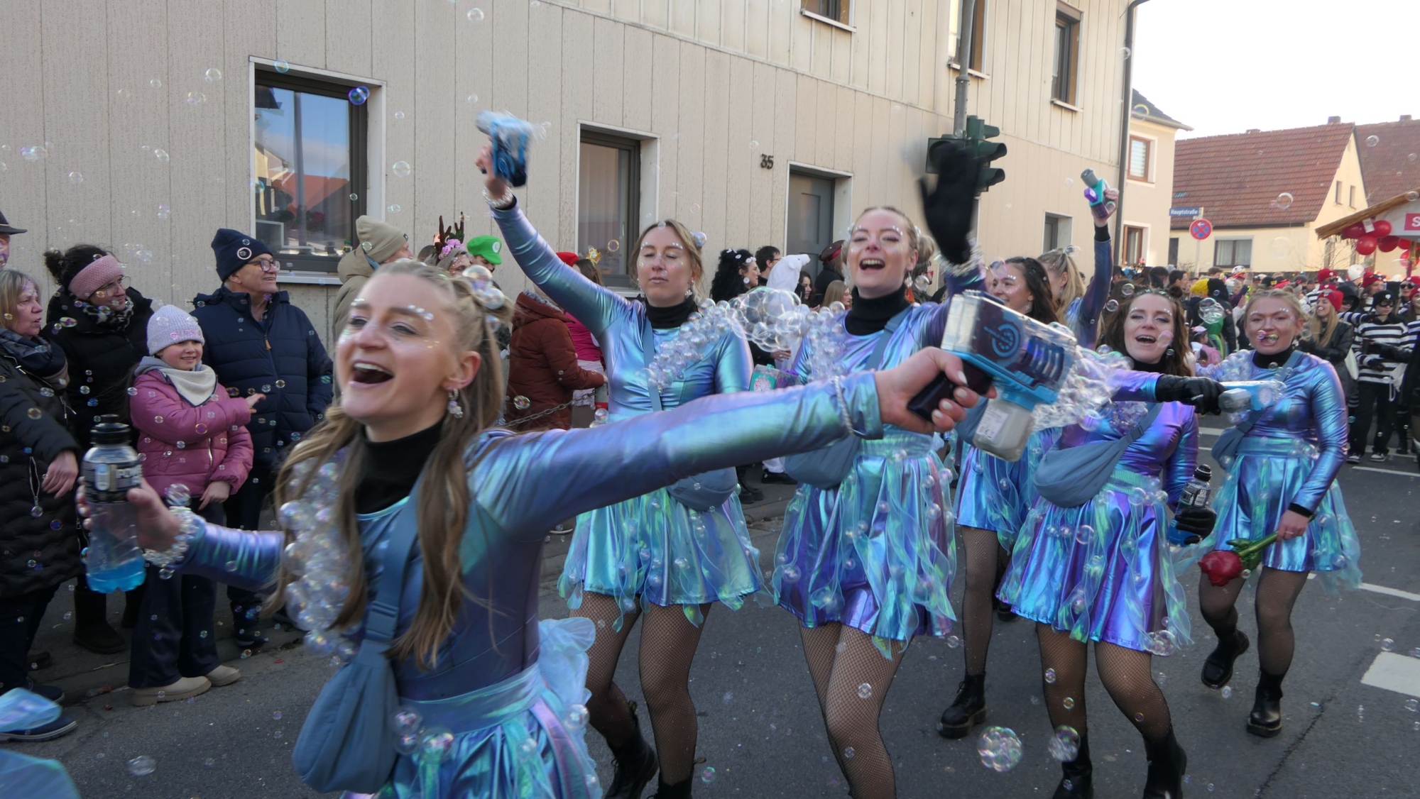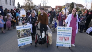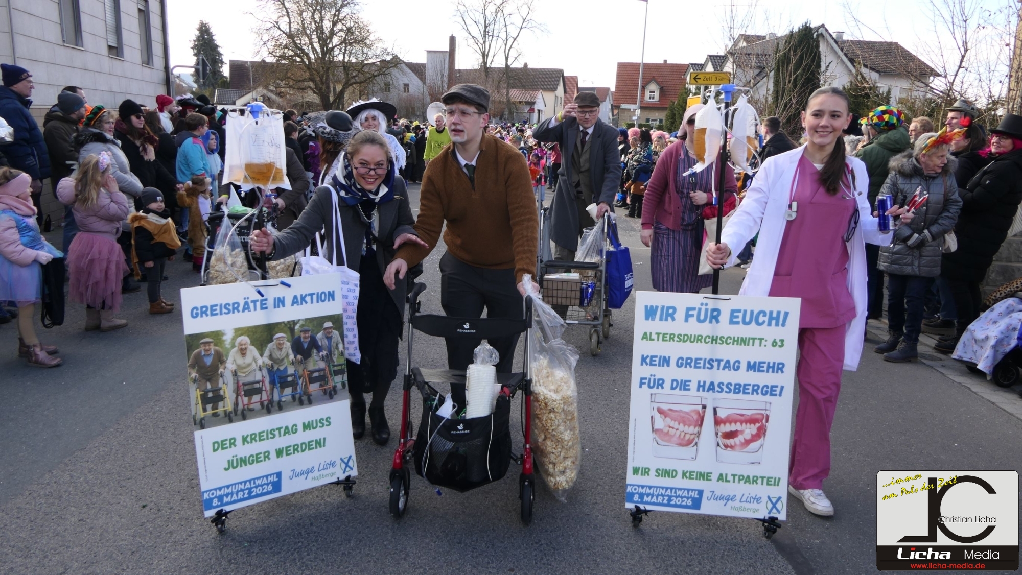 Auch politische Akzente waren im Zug zu finden. Die Junge Liste Haßberge nutzte den Faschingszug für Wahlwerbung und trat als „Greisräte“ mit Rollatoren auf. Ihre Botschaft: Mehr junge Menschen sollen künftig im Kreistag das Sagen haben.