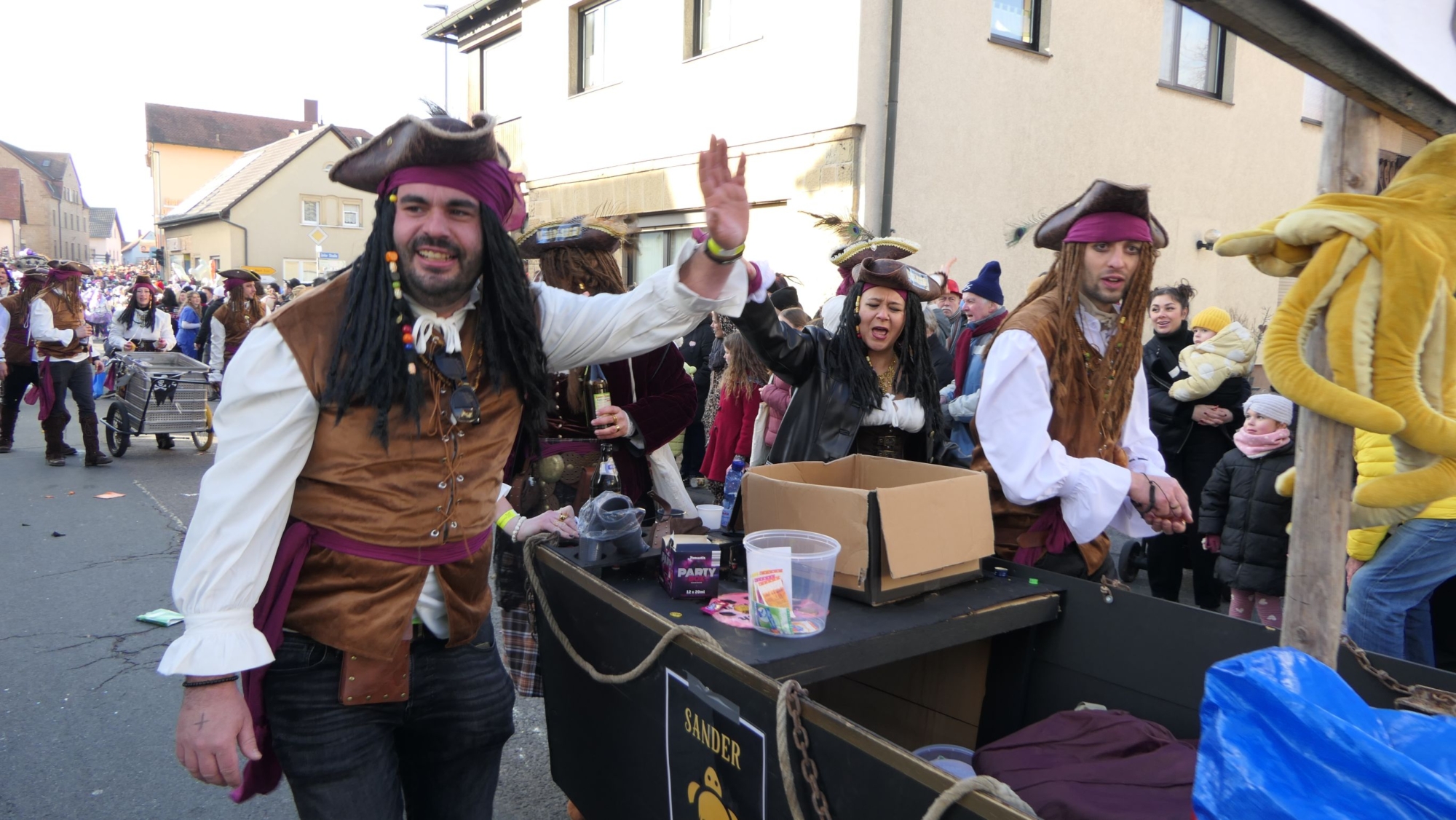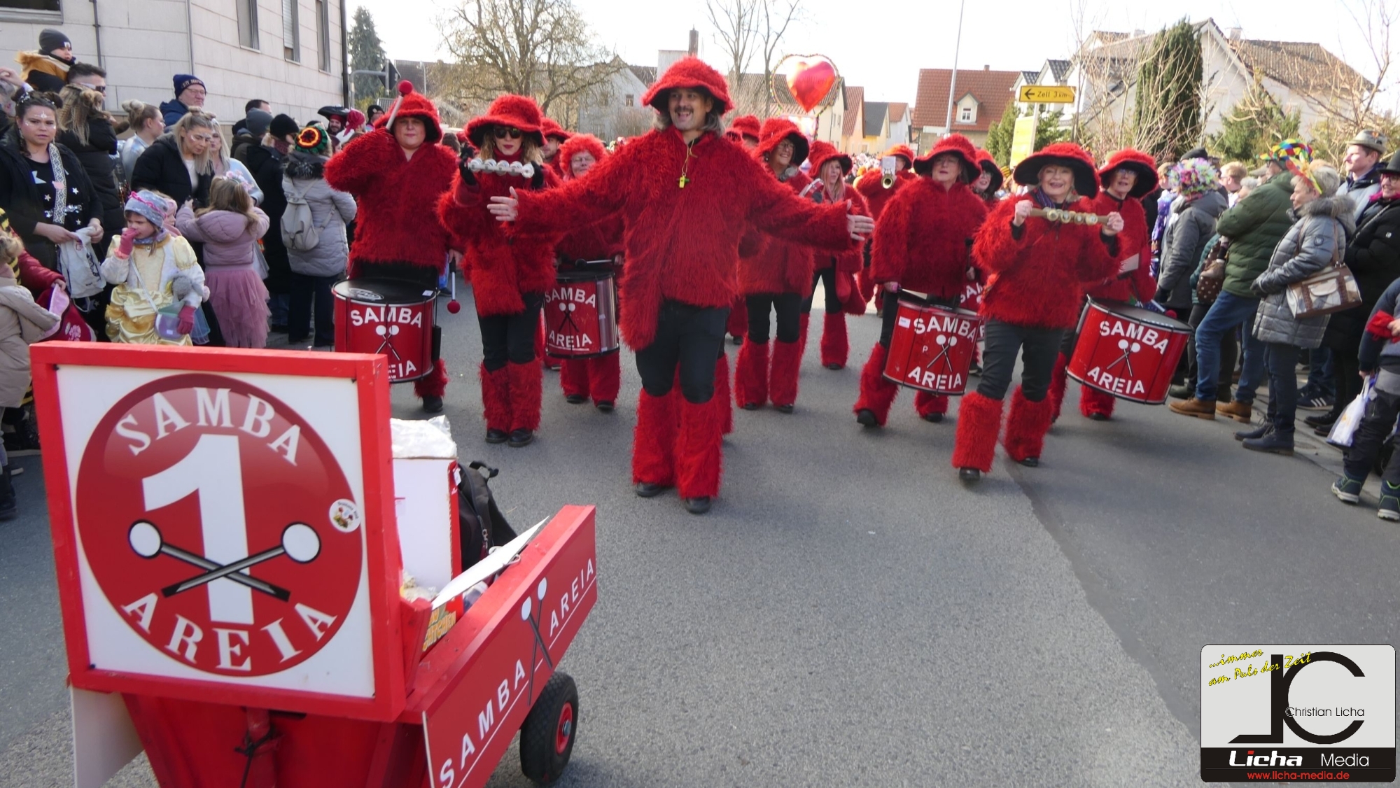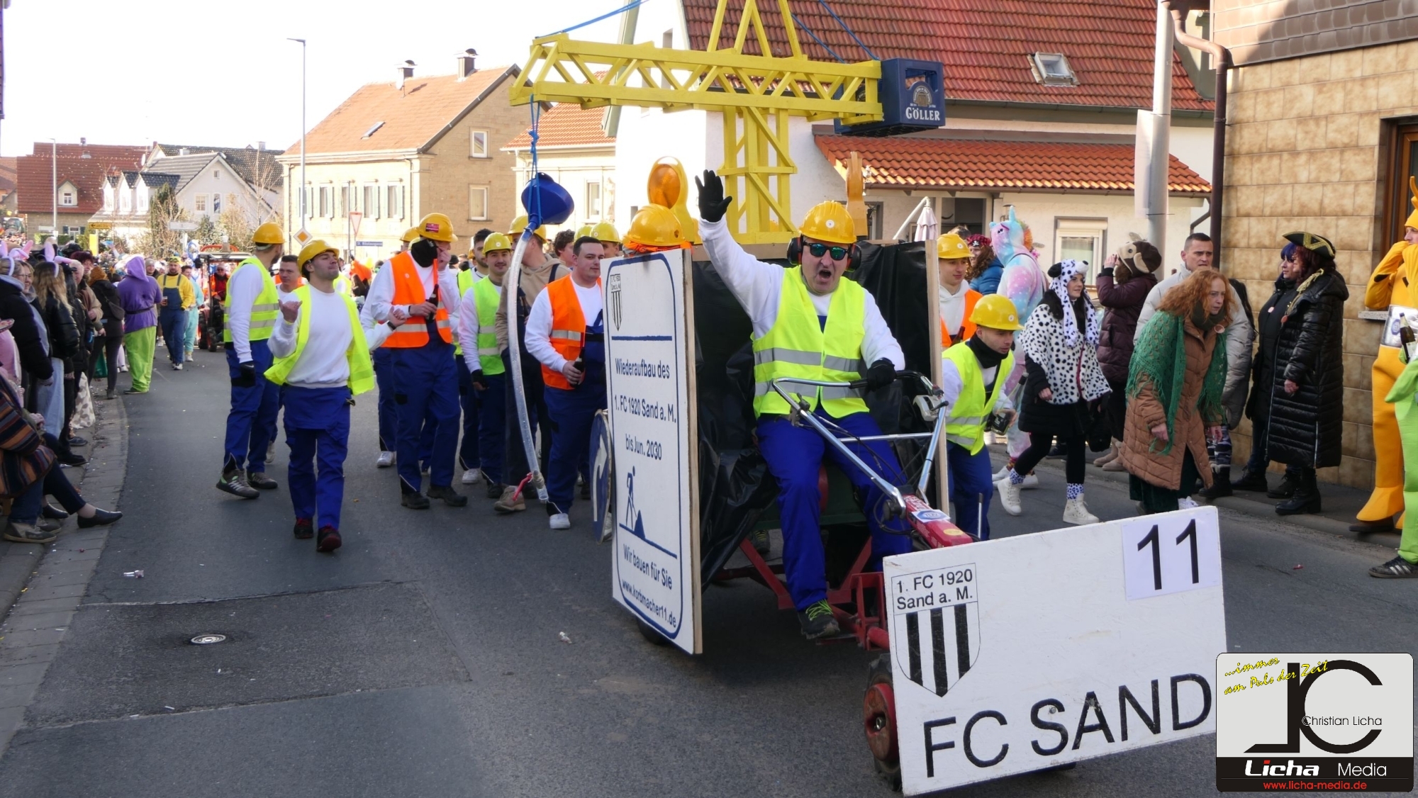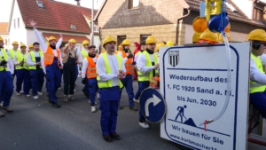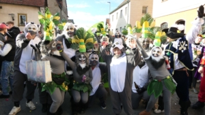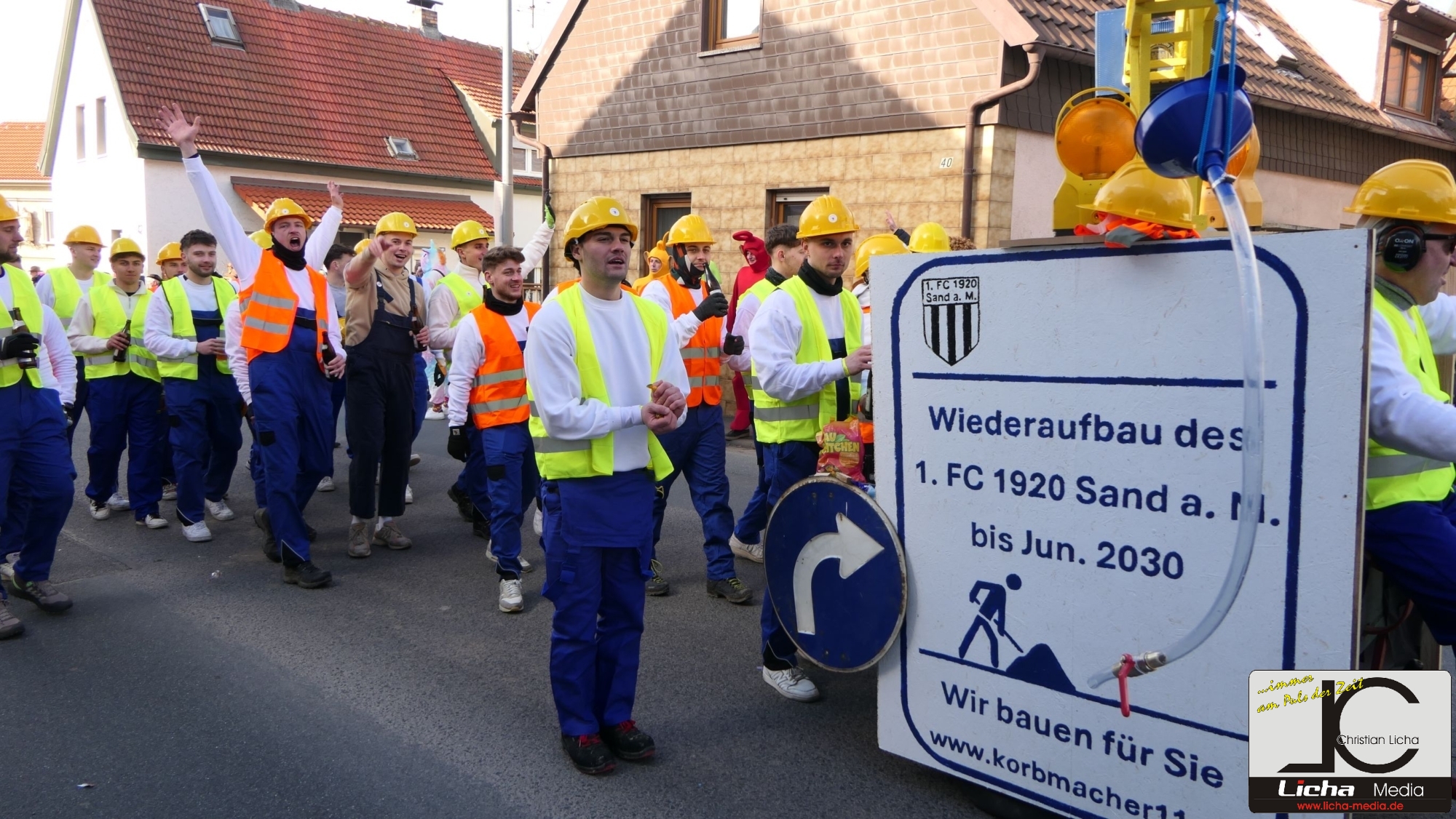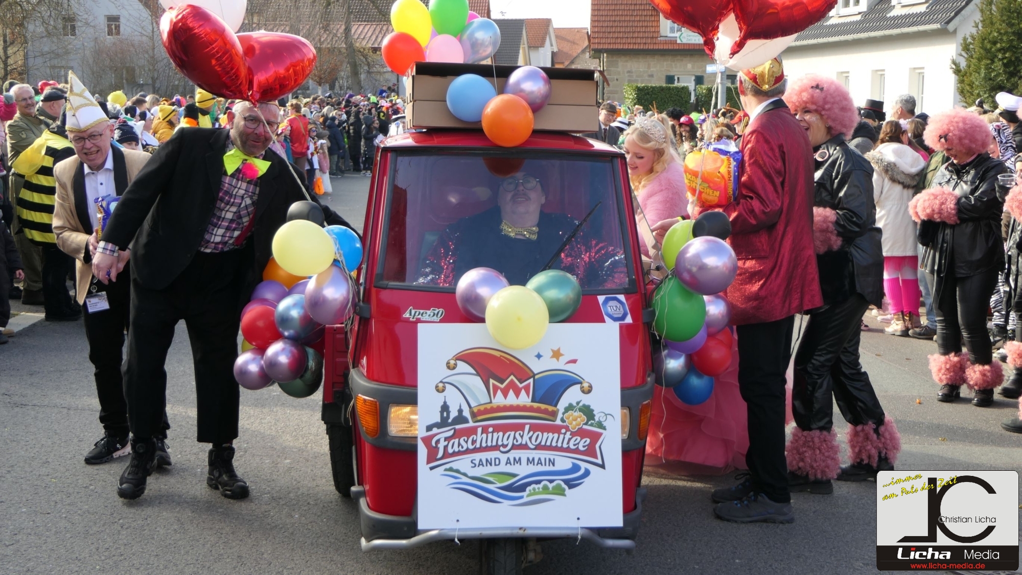 Sand am Main, Lkr. Haßberge. Trotz Temperaturen nur knapp über dem Gefrierpunkt zeigte sich pünktlich zum Start am Sonntagnachmittag die Sonne über der Faschingshochburg Sand am Main. Der größte Faschingszug im Landkreis Haßberge lockte wieder tausende Besucherinnen und Besucher an. Traditionell angeführt von der Samba-Gruppe zogen knapp 60 Fußgruppen und bunte, ideenreich gestaltete Wagen fast zwei Stunden durch die Korbmachergemeinde.