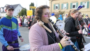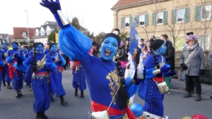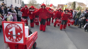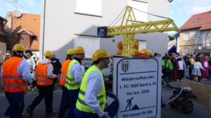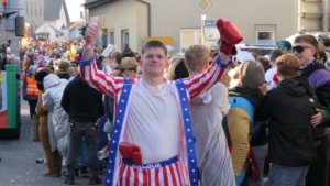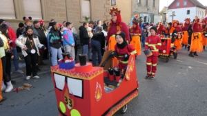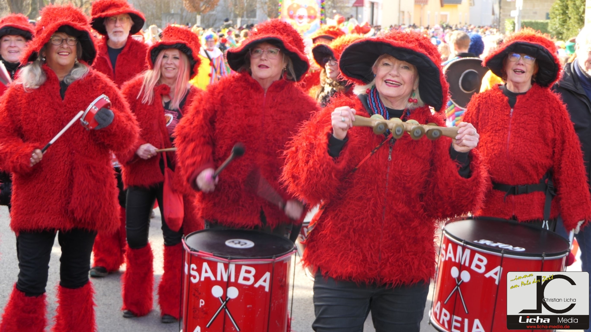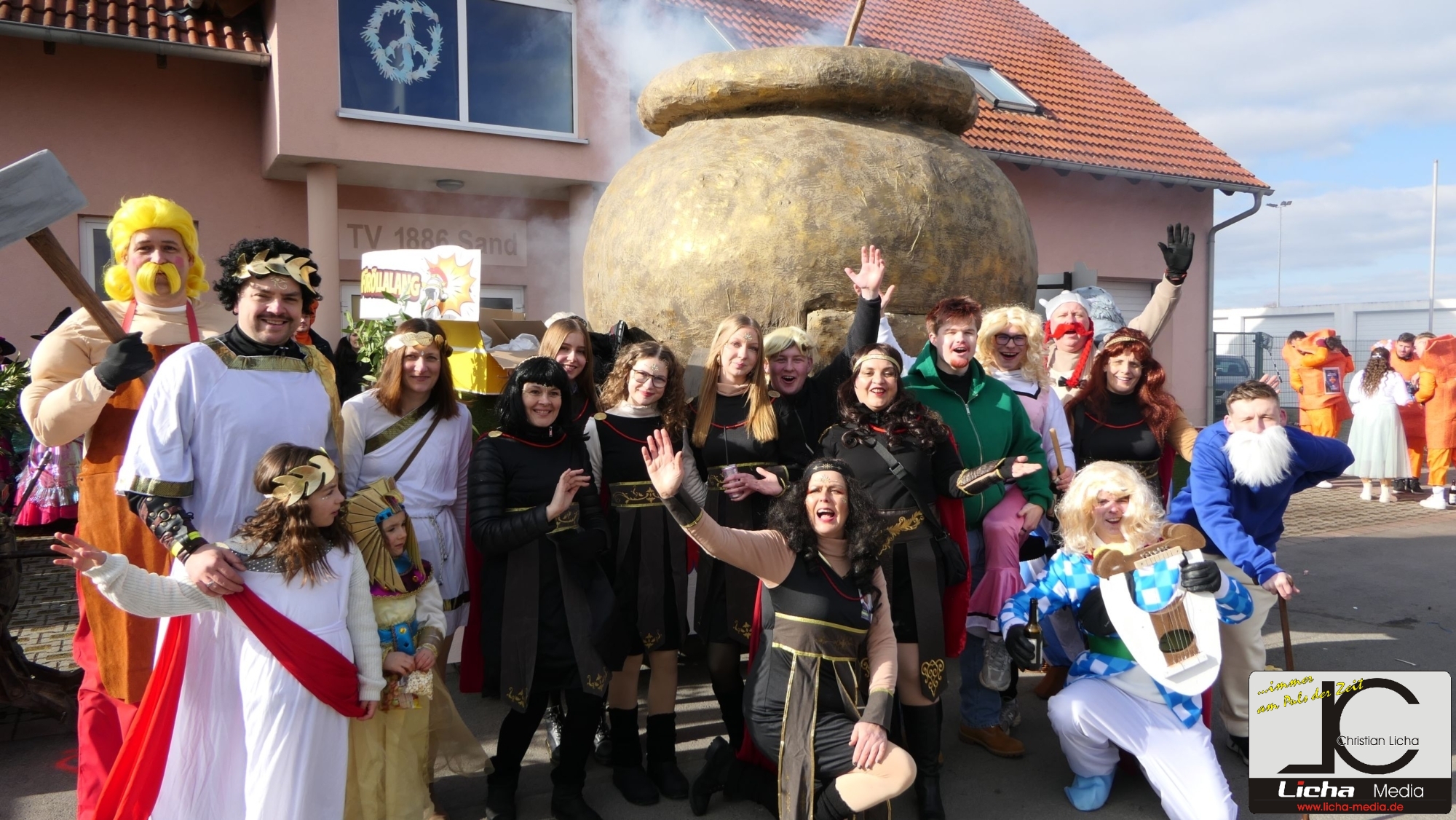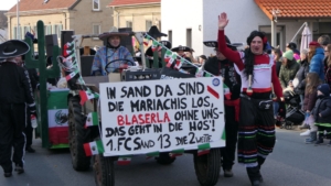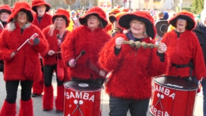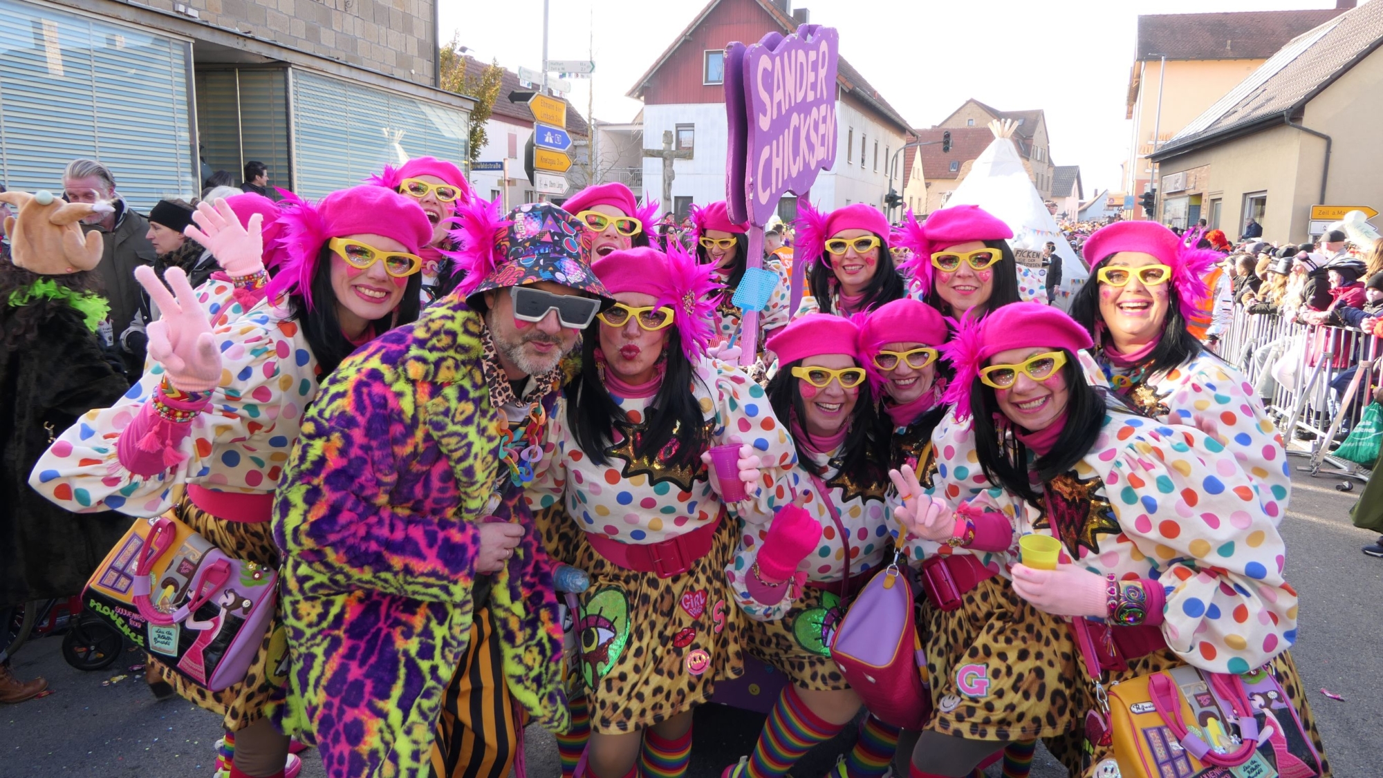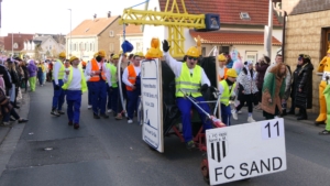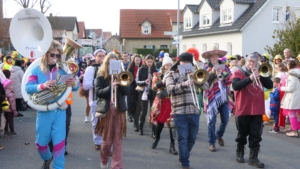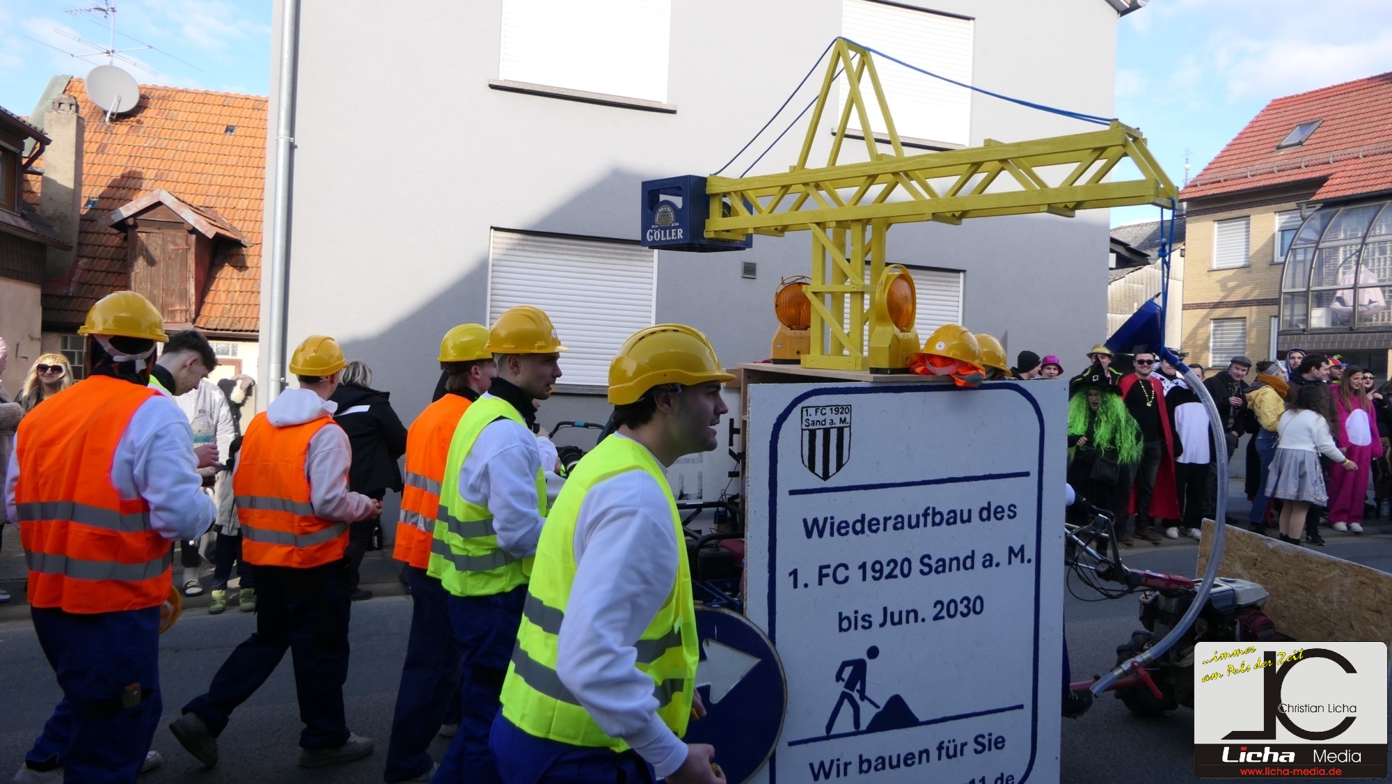 Sand am Main, Lkr. Haßberge. Trotz Temperaturen nur knapp über dem Gefrierpunkt zeigte sich pünktlich zum Start am Sonntagnachmittag die Sonne über der Faschingshochburg Sand am Main. Der größte Faschingszug im Landkreis Haßberge lockte wieder tausende Besucherinnen und Besucher an. Traditionell angeführt von der Samba-Gruppe zogen knapp 60 Fußgruppen und bunte, ideenreich gestaltete Wagen fast zwei Stunden durch die Korbmachergemeinde.