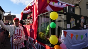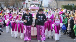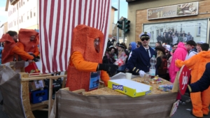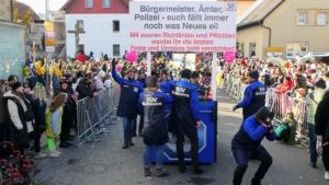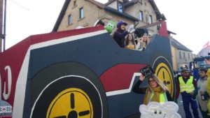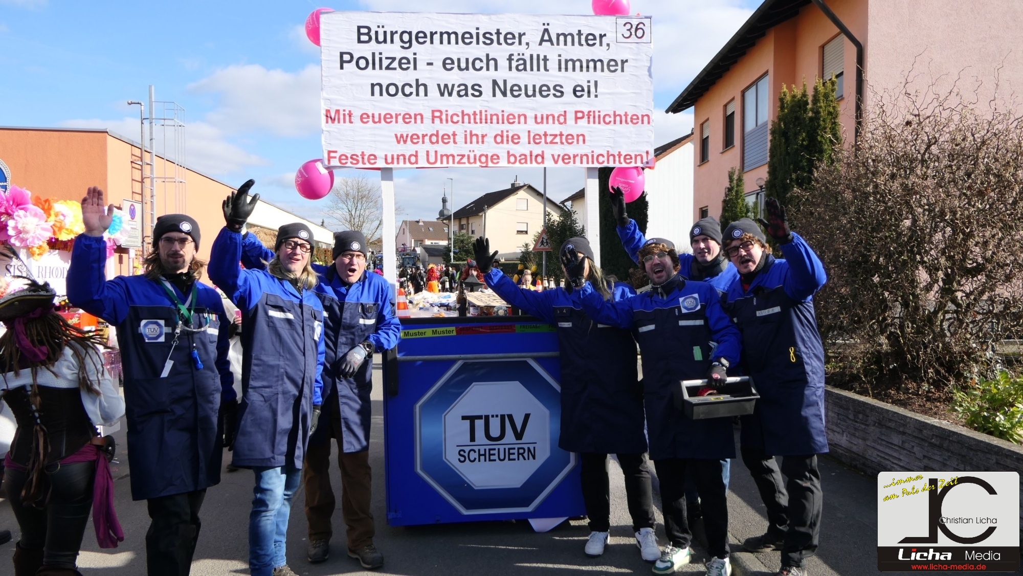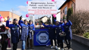 Die Mottogruppe der „Scheuern Sand“ nahm mit ihrem TÜV-Thema eine zunächst verwirrende Mitteilung der Polizei im Vorfeld des Zuges humorvoll aufs Korn. Foto: © Christian Licha