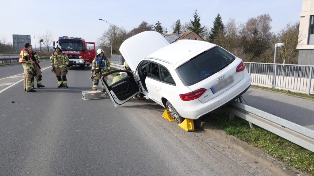 Aus bislang ungeklärter Ursache kam der Fahrer des Audis nach rechts von der Fahrbahn ab und landete mit seinem Wagen auf einer Leitplanke. Foto: © Christian Licha