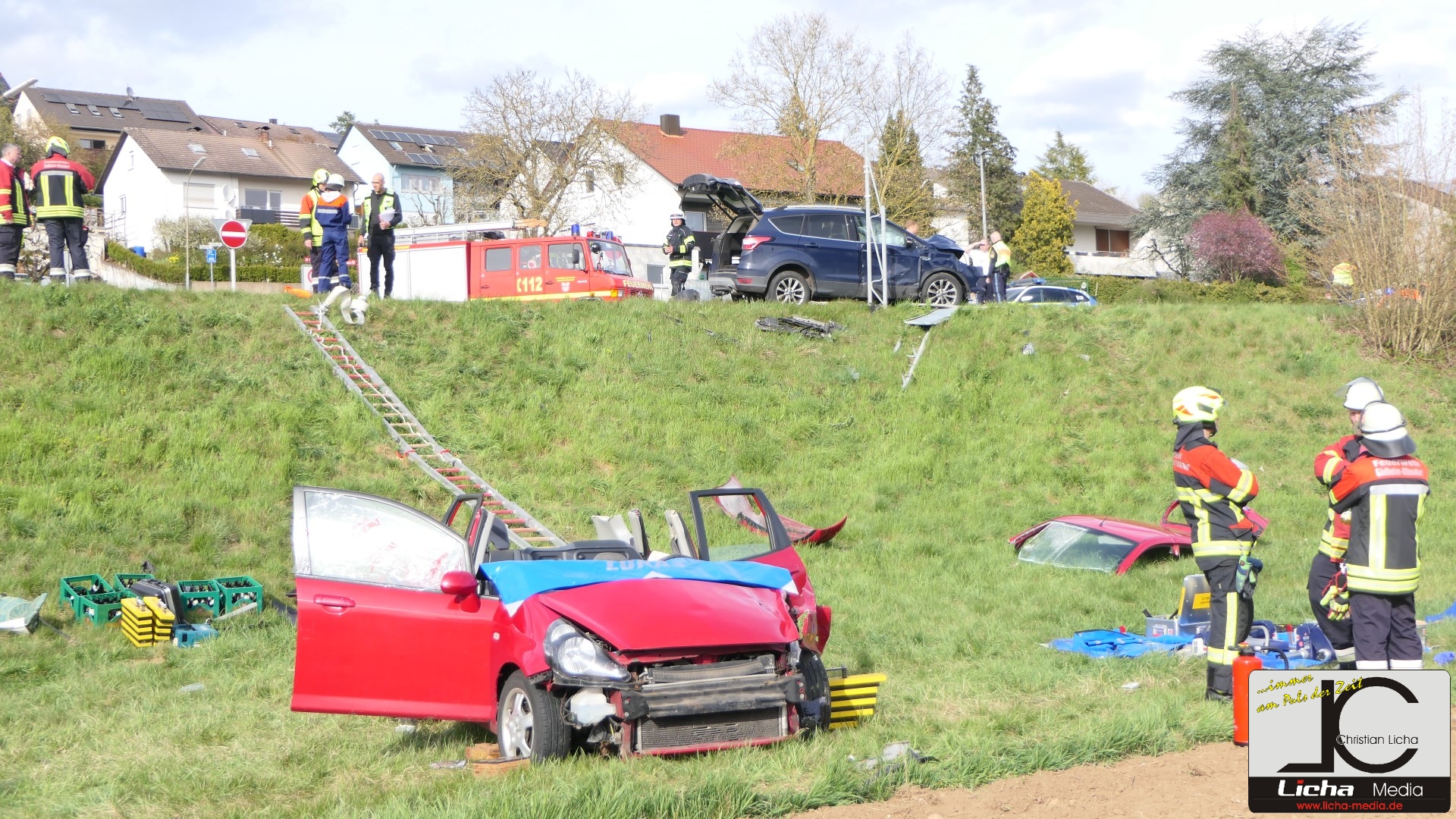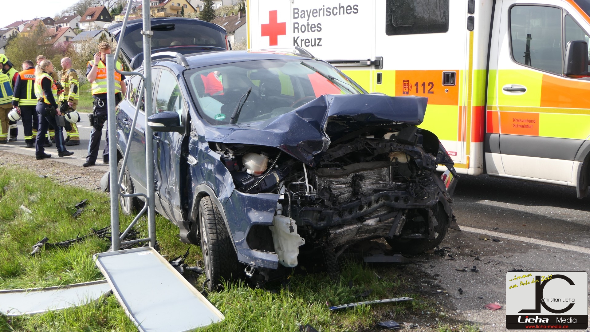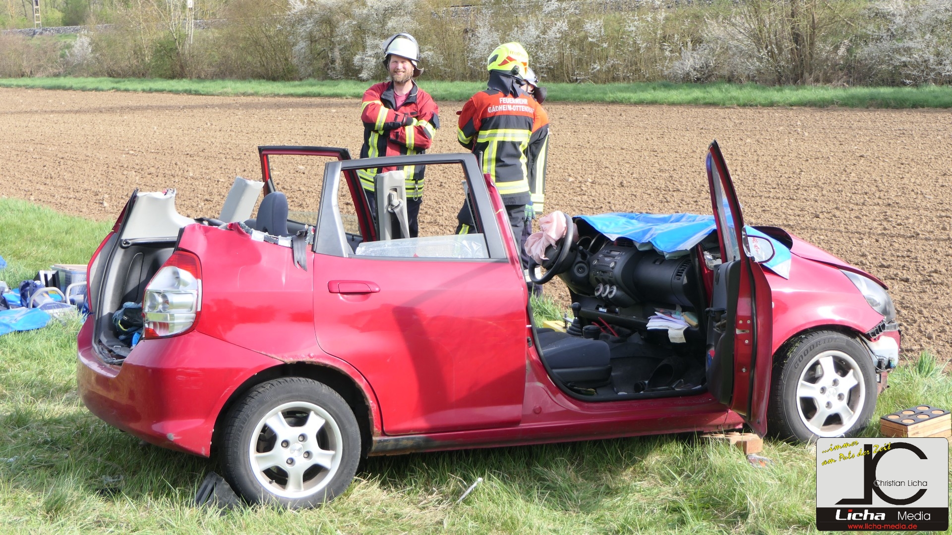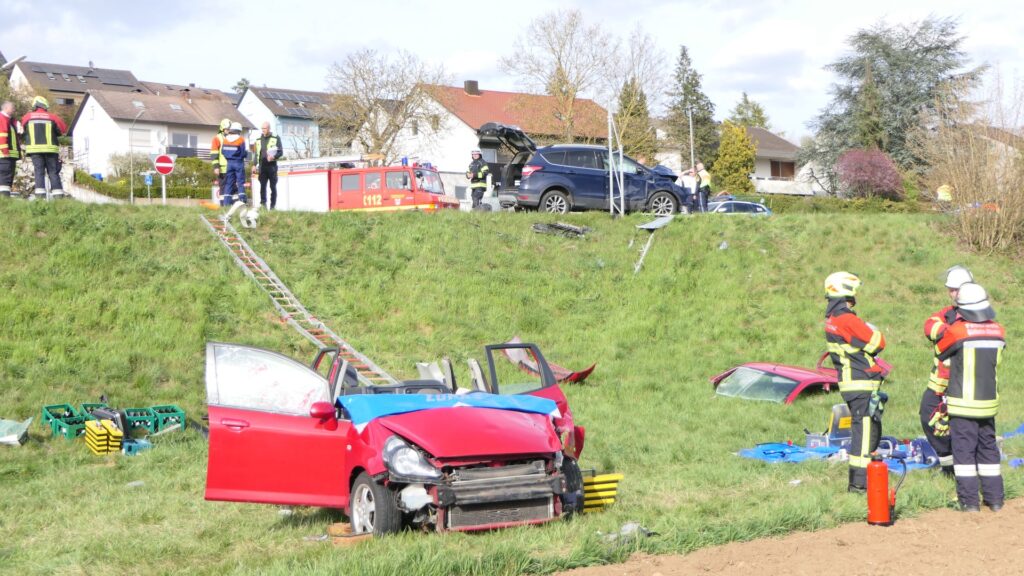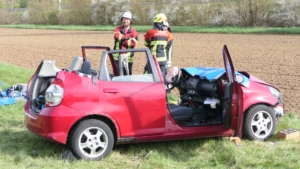 Augenzeugen setzten umgehend einen Notruf ab. Die Integrierte Leitstelle (ILS) Schweinfurt alarmierte daraufhin die Feuerwehren aus Gädheim-Ottendorf, Schonungen und Forst sowie einen Fachberater des Technischen Hilfswerks (THW) Haßfurt. Die rund 50 Einsatzkräfte waren zusammen mit dem Rettungsdienst schnell vor Ort. Während der Fahrer des Ford sein Fahrzeug eigenständig verlassen konnte und mittelschwer verletzt wurde, waren Mutter und Sohn im Honda eingeschlossen.