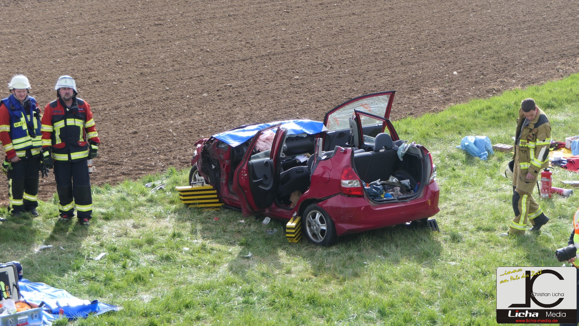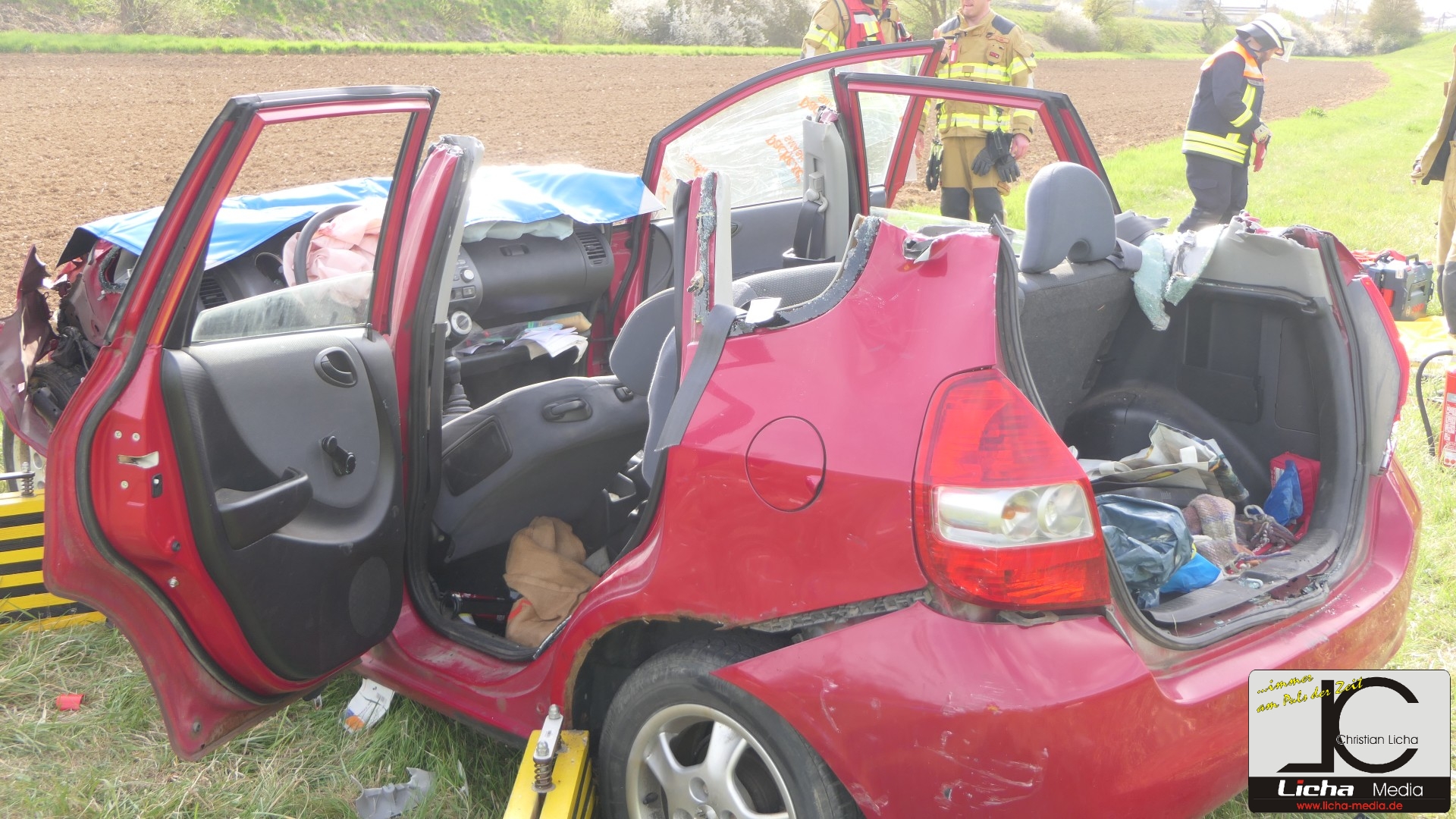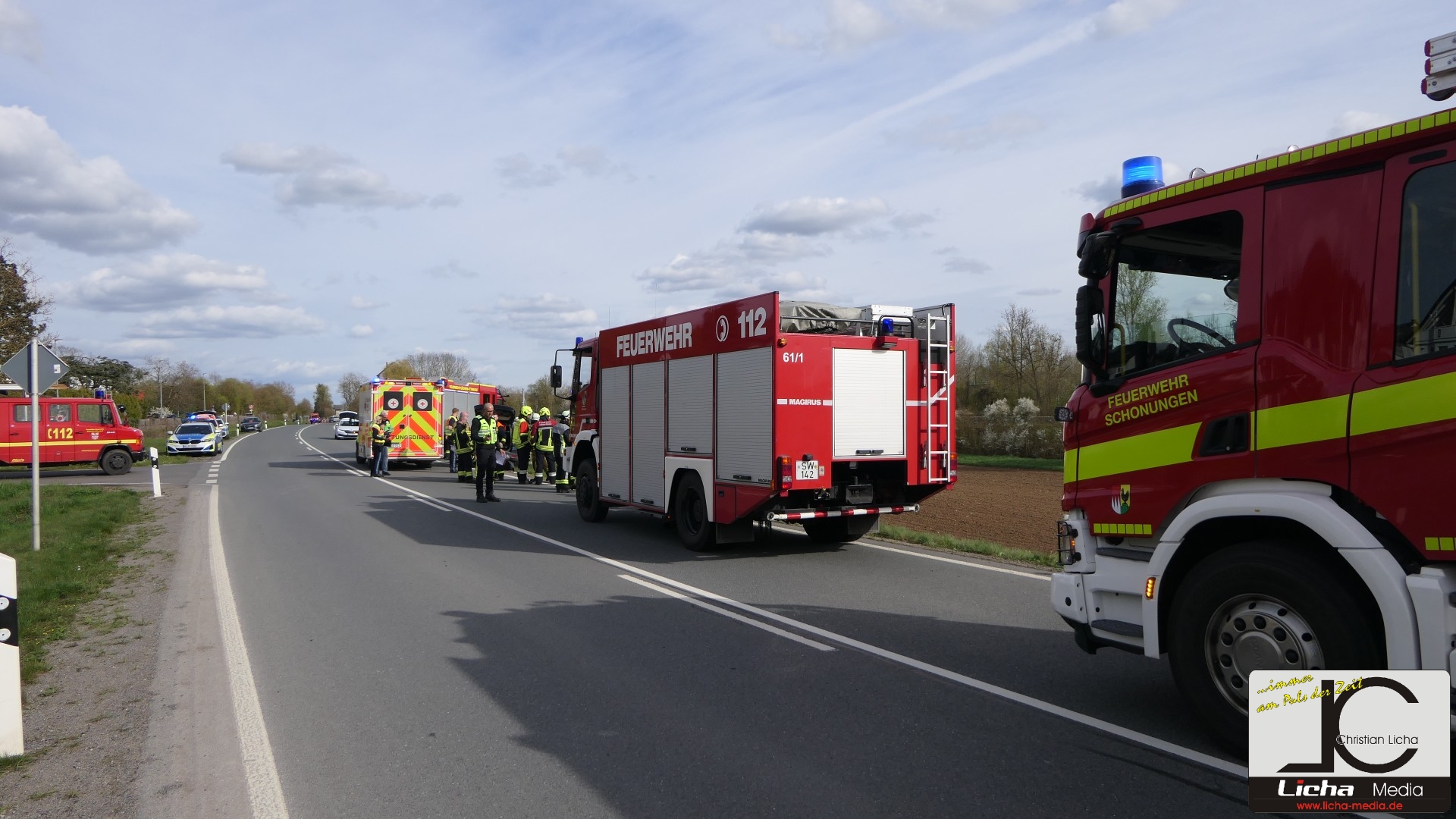 Augenzeugen setzten umgehend einen Notruf ab. Die Integrierte Leitstelle (ILS) Schweinfurt alarmierte daraufhin die Feuerwehren aus Gädheim-Ottendorf, Schonungen und Forst sowie einen Fachberater des Technischen Hilfswerks (THW) Haßfurt. Die rund 50 Einsatzkräfte waren zusammen mit dem Rettungsdienst schnell vor Ort. Während der Fahrer des Ford sein Fahrzeug eigenständig verlassen konnte und mittelschwer verletzt wurde, waren Mutter und Sohn im Honda eingeschlossen.