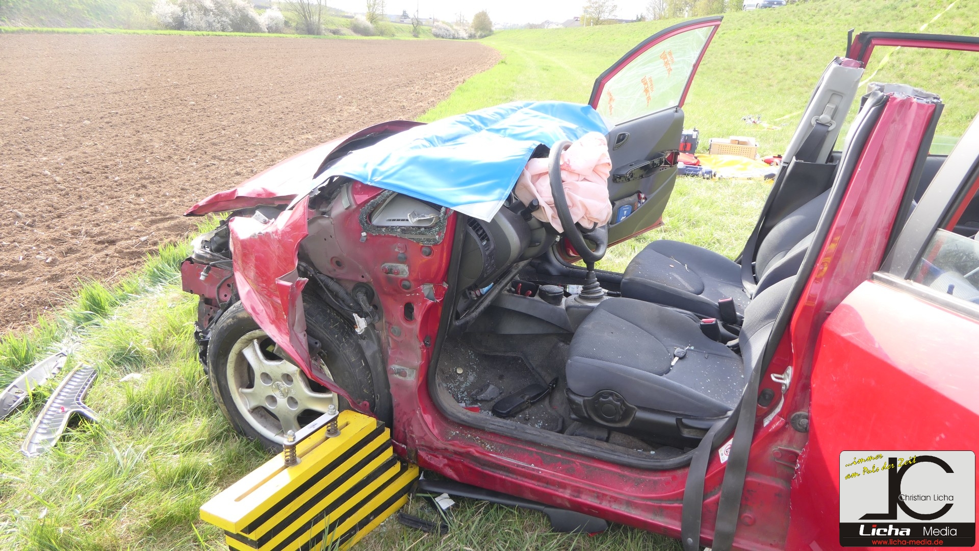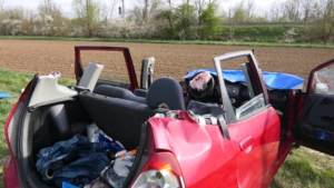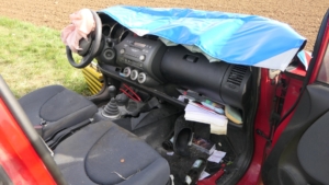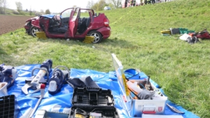 Zur Rettung mussten die Einsatzkräfte schweres Gerät einsetzen. „Wir haben das Dach abgenommen. Dabei kamen die beiden hydraulischen Rettungssätze der Feuerwehren Gädheim-Ottendorf und Schonungen gleichzeitig zum Einsatz, jede Seite wurde parallel bearbeitet“, erklärte Stefan Kuhn, der stellvertretende Kommandant der Feuerwehr Gädheim-Ottendorf, der auch die Einsatzleitung innehatte. Auch Kreisbrandinspektor Thomas Neeb und Kreisbrandmeister Dominik Mroz unterstützten die Maßnahmen.