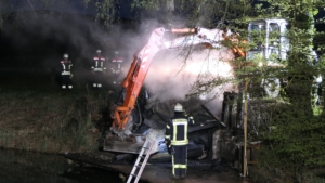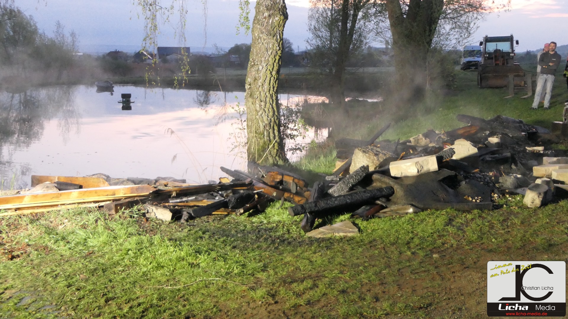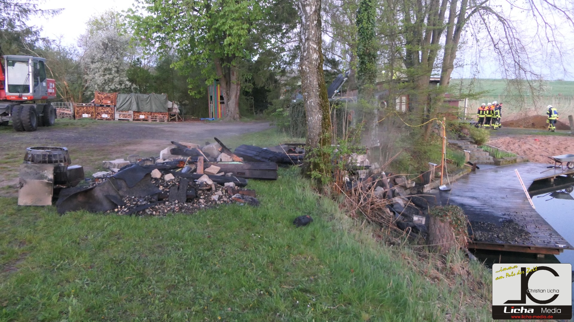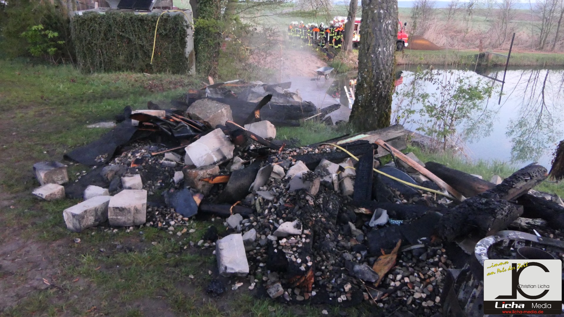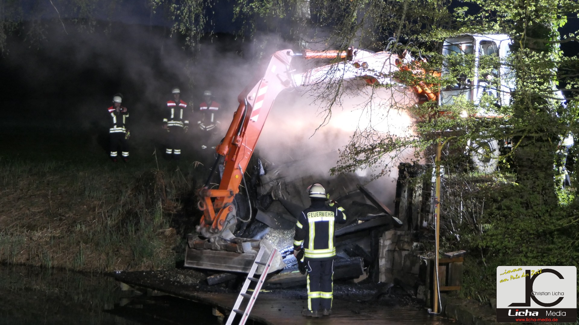 Mehrere Trupps unter Atemschutz nahmen umgehend die Brandbekämpfung auf. Die Löschwasserversorgung war durch den unmittelbar angrenzenden See gesichert, was sich als großer Vorteil erwies. Für die Nachlöscharbeiten musste der Brandschutt auseinandergezogen werden. Dabei unterstützte ein örtlicher Bauunternehmer mit einem Bagger, sodass auch tieferliegende Glutnester freigelegt und gezielt abgelöscht werden konnten.