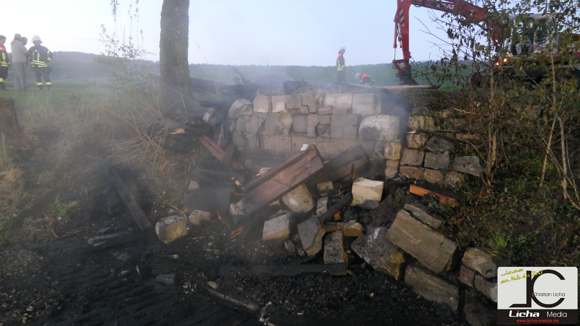 Knetzgau / Wohnau, Lkr. Haßberge. Eine Gartenhütte ist am frühen Freitagmorgen im Knetzgauer Ortsteil Wohnau in Flammen aufgegangen. Mehr als 50 Einsatzkräfte der Feuerwehr waren rund zwei Stunden im Einsatz, um den Brand zu löschen.